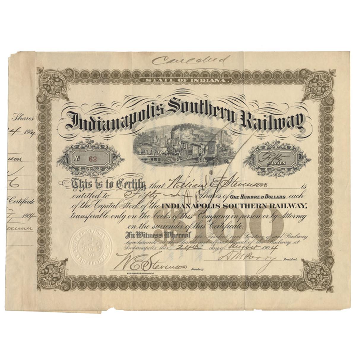 Early 1904, Indiana. Stock certificate for 50 shares. Gold /Black. Vignette of train at top center. The company was incorporated on September 15, 1899 to construct a road from Indianapolis to Sullivan, Indiana. The Illinois Central RR purchased the company in foreclosure in 1911. Pen cancelled. Splits at fold Fine.