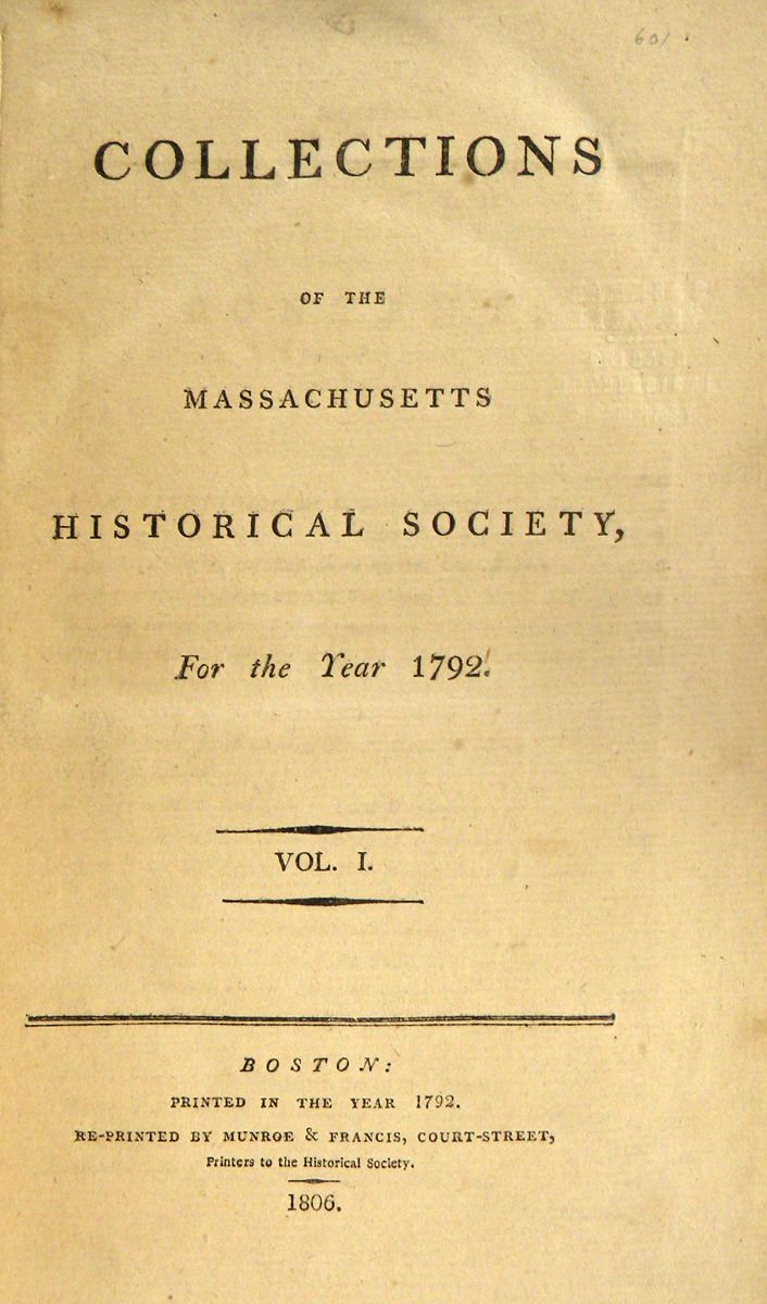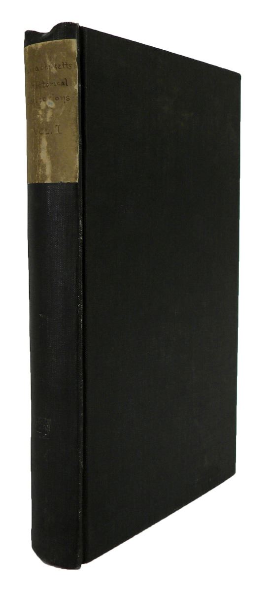 Massachusetts Historical Society. COLLECTIONS OF THE MASSACHUSETTS HISTORICAL SOCIETY, FOR THE YEAR 1792. Second printing. Boston: Munroe & Francis, 1806. 8vo, later black cloth; paper spine label. (4), 288 pages. Ex-library with pocket and labels, but with minimal other markings. Endpapers detached. Very good. The scarce 1806 reprint of the rare initial volume of the Collections of the Massachusetts Historical Society. Includes Daniel Gookin’s “Historical Collections of the Indians in New-England,” which features a 17th-century description of wampum. Evans 24530 (reprint).