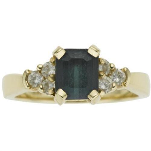 <B>Indicolite Tourmaline, Diamond, Gold Ring</B></I><BR><BR>The ring centers an emerald-cut indicolite tourmaline measuring 6.75 x 5.70 x 4.10 mm and weighing approximately 1.20 carats, enhanced by full-cut diamonds weighing a total of approximately 0.35 carat, set in 14k yellow gold. Gross weight 4.50 grams.<BR>Note: Size 6-3/4 (sizeable)<BR><BR> <B>Condition Report:</B> Very good condition.<BR><BR><BR><b>Shipping:</b> Miscellaneous Collectibles, Smal (<a target="_blank" href="http://www.heritageauctions.com/common/shipping.php">view shipping information</a>)
