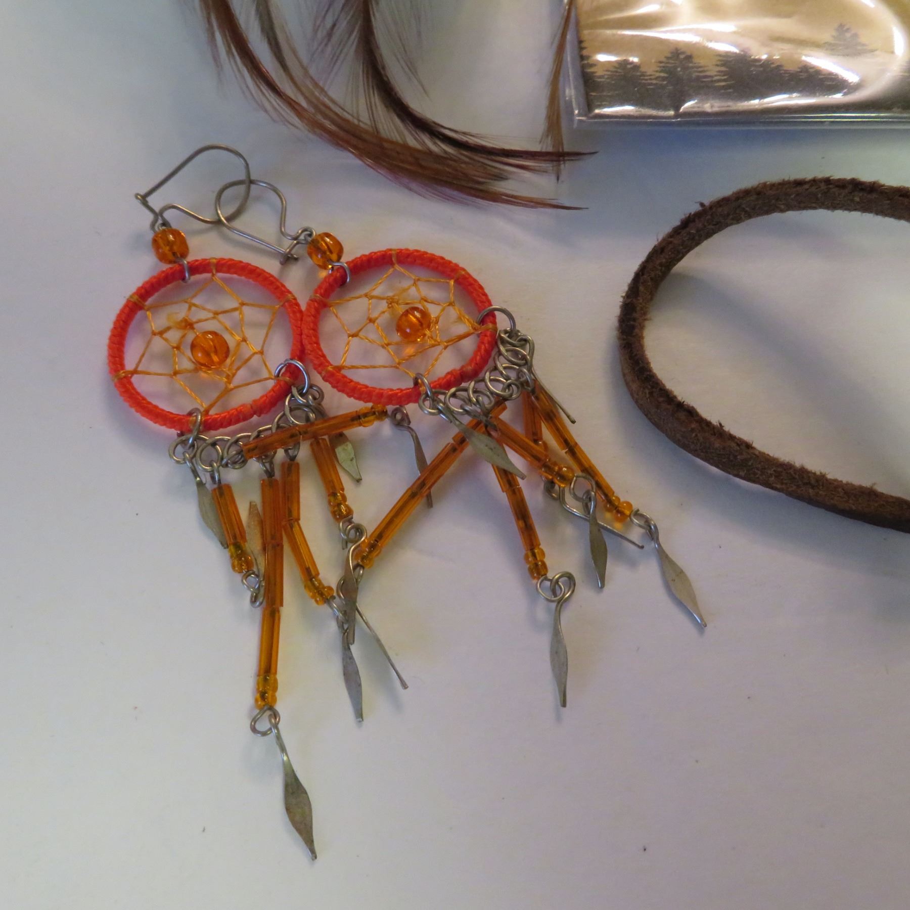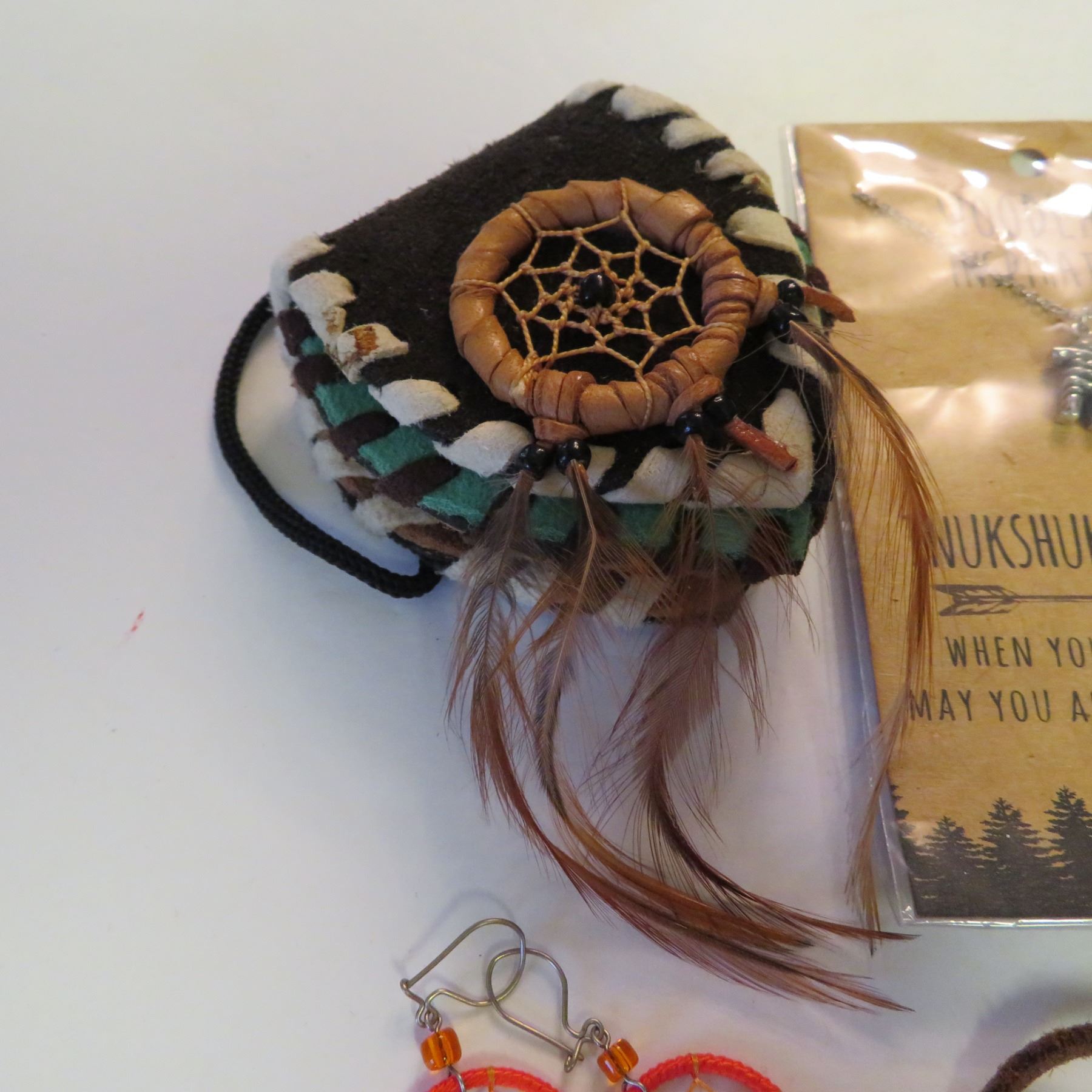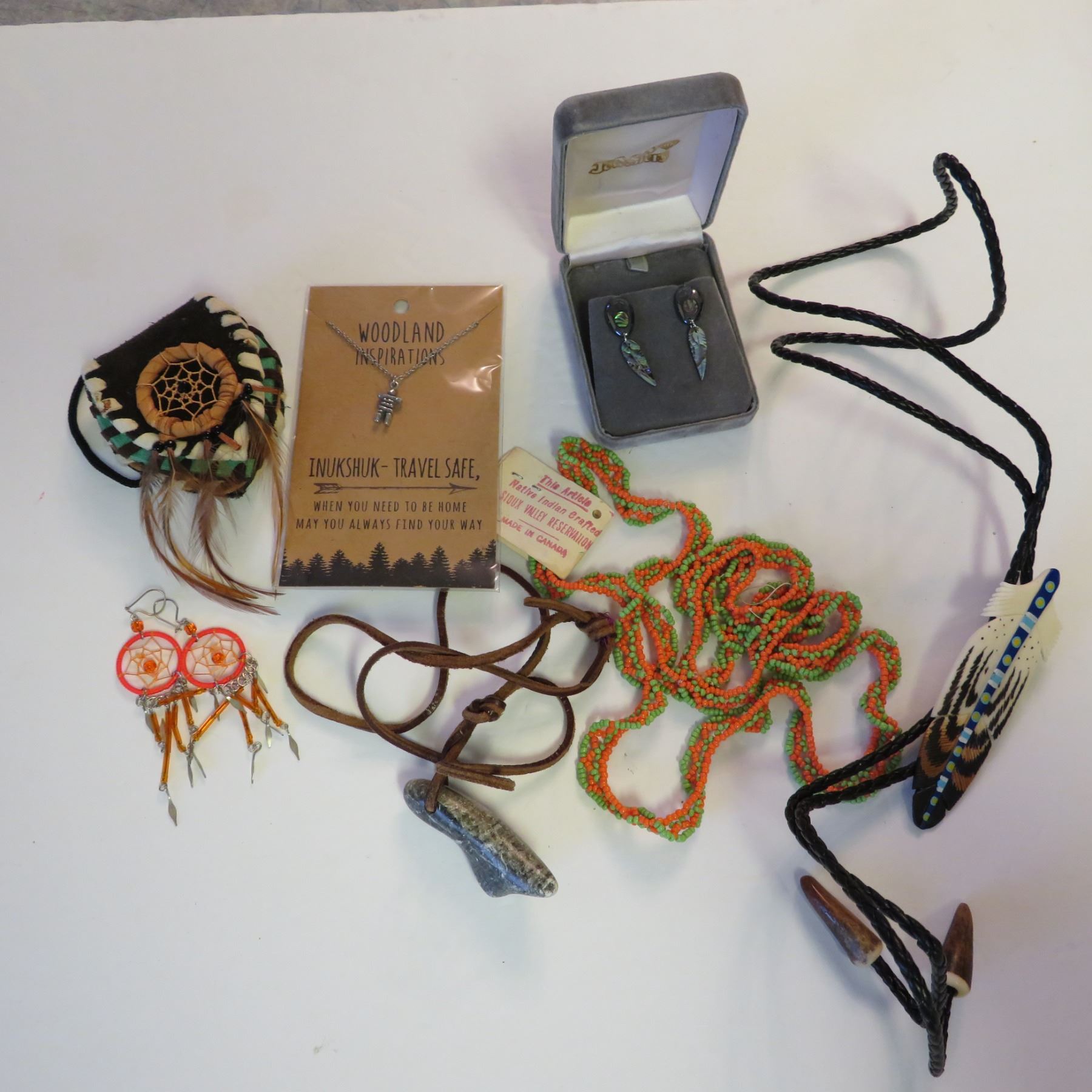 Includes Inukshuk necklace, bear paw earrings, dream catcher earrings, a small purse with feathers, a soapstone necklace, a vintage necklace made in Canada "Native Indian Crafted Sioux Valler Reservation", and a beautiful feather bolo tie.