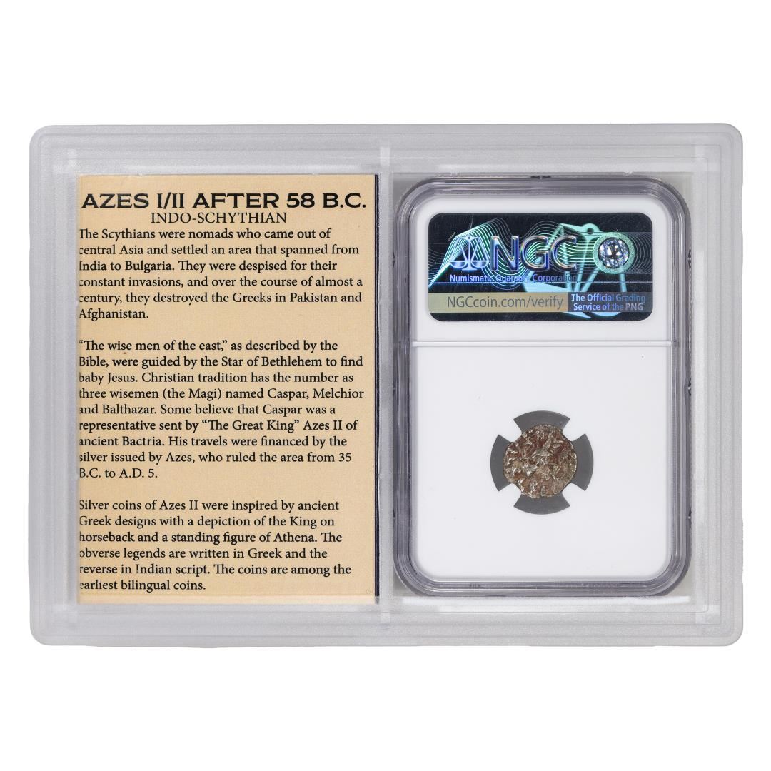 Indio-Sycythians c.58 BC Azes I/II AR Drachm Ancient Coin NGC VF Story Box