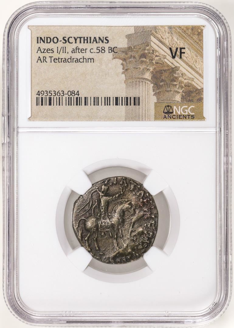 One Indio-Sythians c.58 BC Azes I/II AR Tetradrachm Ancient Coin NGC VF. NGC Certified.