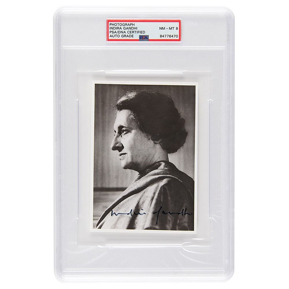 Glossy 4 x 5.5 photo of Indira Gandhi in a bust-length profile pose, signed in black felt tip. In fine condition, with a small emulsion flaw on her neck. Encapsulated and graded by PSA/DNA as "NM-MT 8."