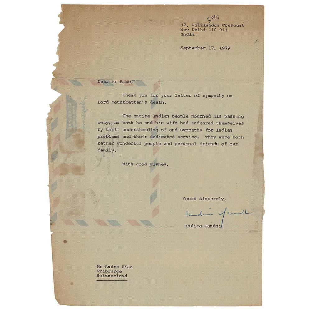 TLS, one page, 8 x 11, September 17, 1979. Letter to Andre Bise, in full: “Thank you for your letter of sympathy on Lord Mountbatten’s death. The entire Indian people mourned his passing away, as both he and his wife had endeared themselves by their understanding of and sympathy for Indian problems and their dedicated service. They were both rather wonderful people and personal friends of our family.” In very good to fine condition, with scattered toning, splitting along the intersecting folds, and a rough left edge. Accompanied by a transmittal letter from Gandhi's private secretary, R. K. Goel, for an earlier, unrelated letter.