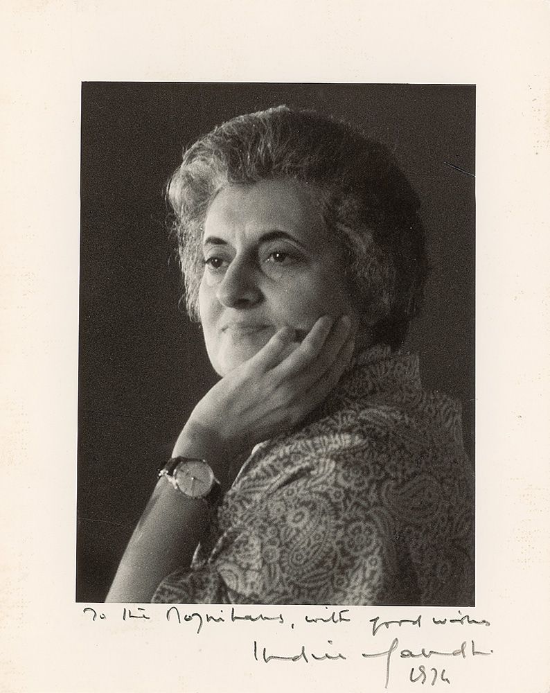 Longtime and controversial Prime Minister of India (1917–1984), the first female leader of that country, who was assassinated by Sikh extremists. Matte-finish 8 x 10 photo, signed and inscribed in the lower border in black felt tip “To the Nogmihans, with good wishes, Indira Gandhi 1976.” Scattered creases to borders and image, otherwise fine condition.