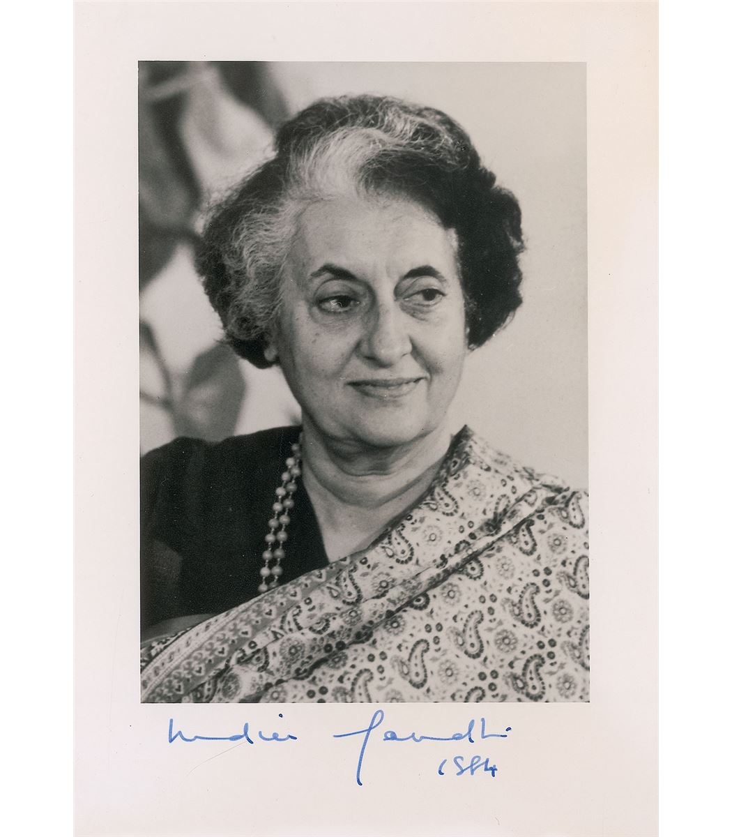 Matte-finish 5.75 x 8.25 photo of Gandhi, signed in the lower border in blue ink, “Indira Gandhi, 1984.” In fine condition, with trivial paperclip impressions to upper edge. Accompanied by a letter of transmittal from the office of the prime minister.