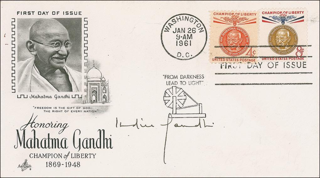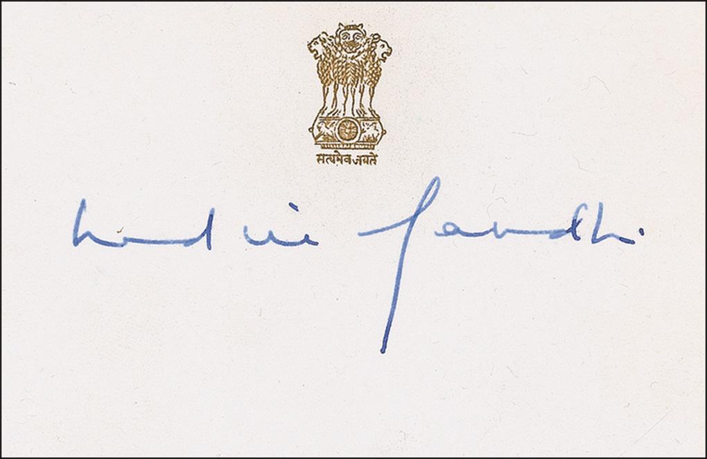 Two items: an FDC bearing a cachet honoring Mahatma Gandhi, signed in black ink; and a blue ballpoint signature on an embossed 3.75 x 2.5 off-white card. Accompanied by the original mailing envelope and 1983 letter from the Prime Minister’s Office acknowledging the signature. In fine condition.