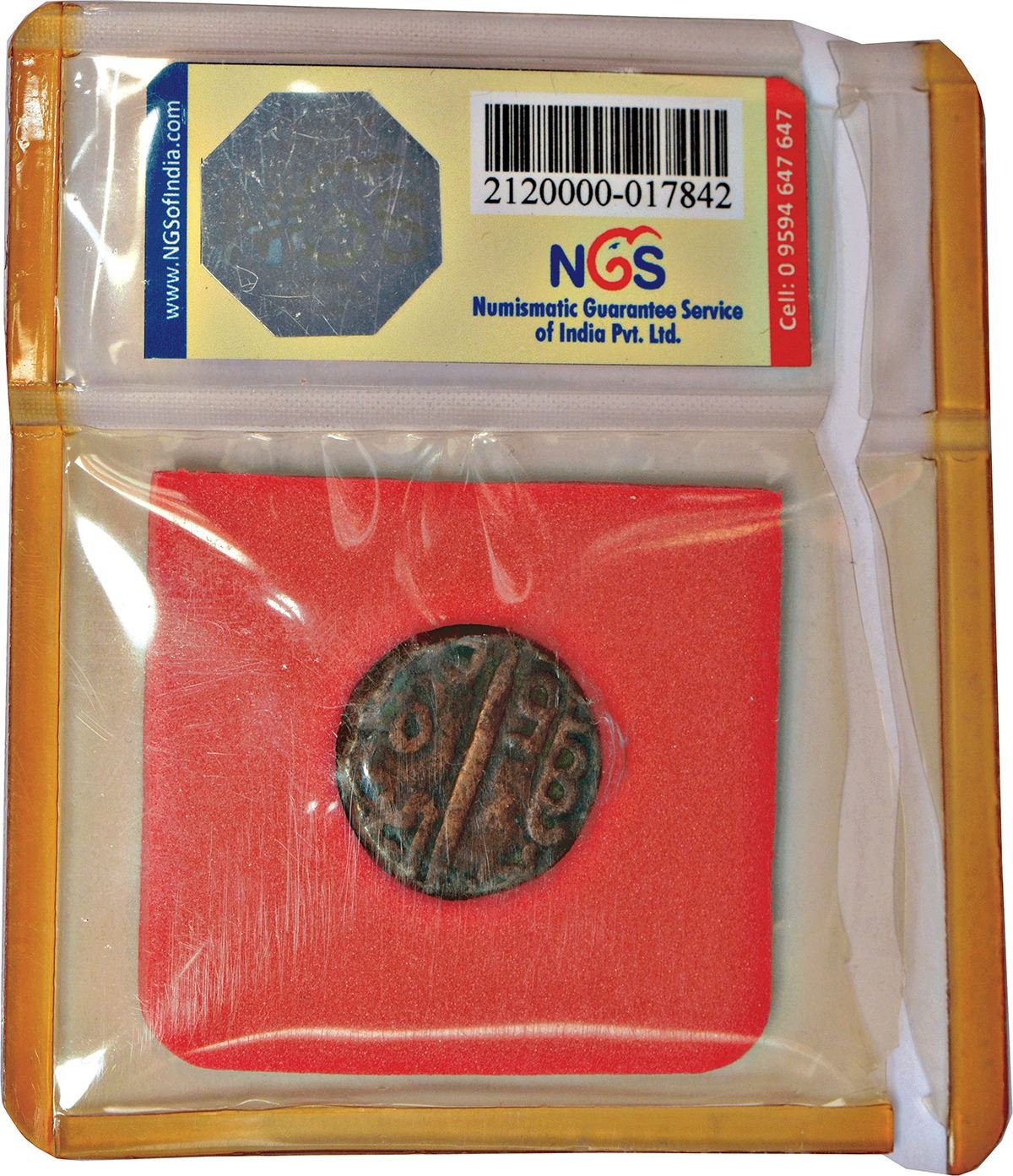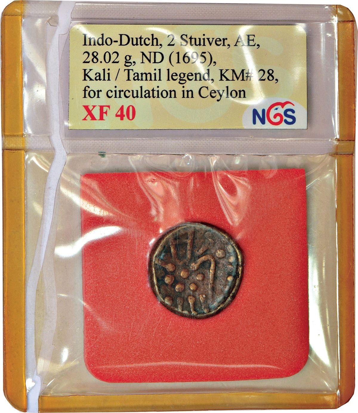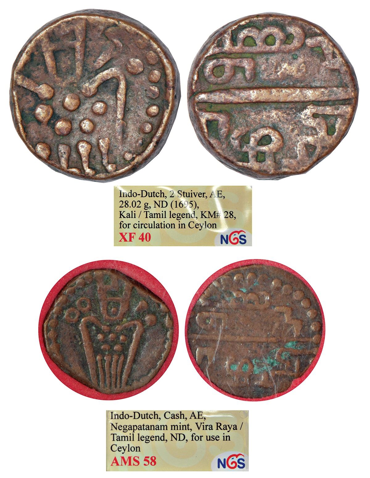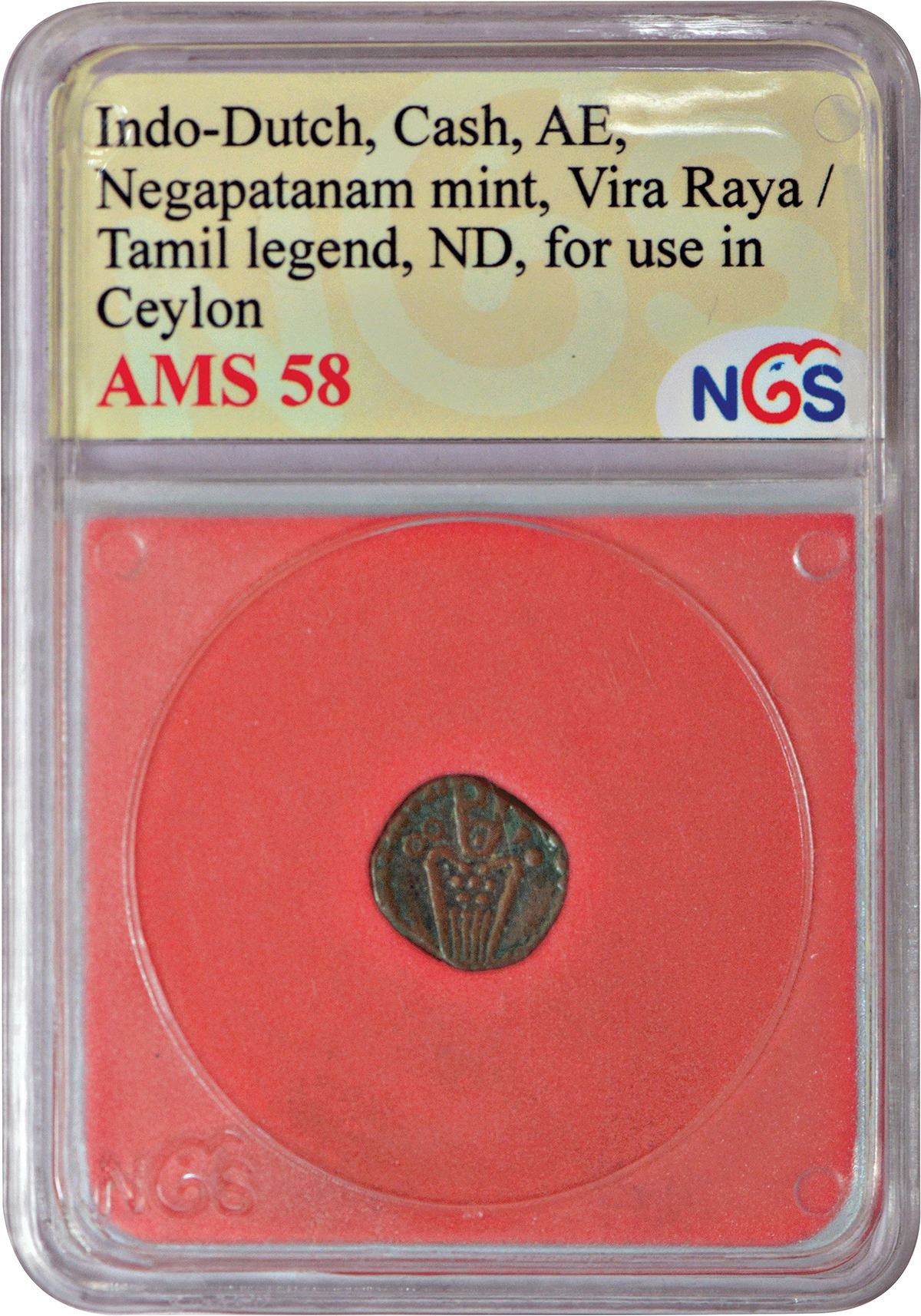 Copper coins (2), Nagapatnam mint, struck for use in Ceylon, (a) Stuiver, KM 28, wrongly described as 2 stuiver instead of 1 stuiver, Graded as XF40 by NGS of India, grading pack broken and (b) Cash, Graded as AMS58 by NGS of India. (2 coins)