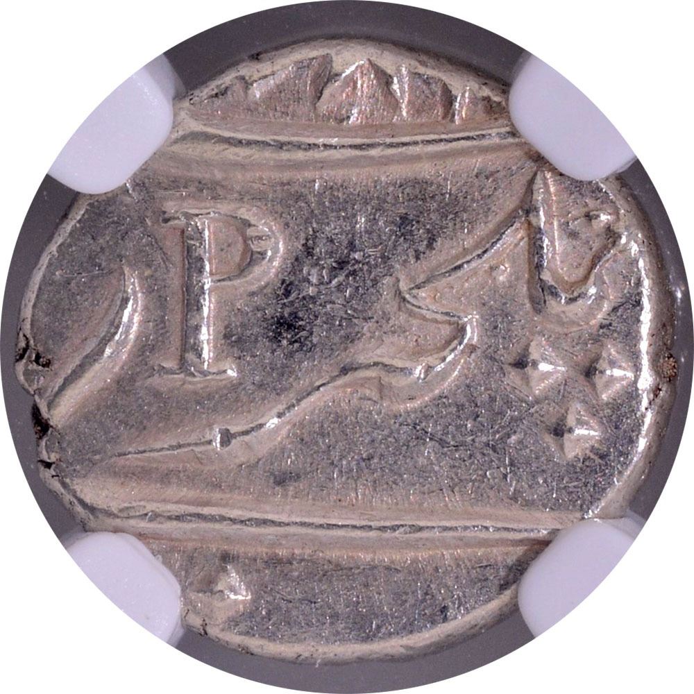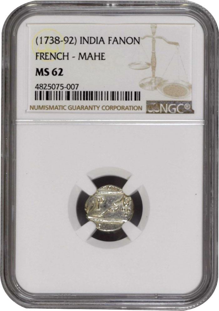 Indo-French,Mahe, Bhulcheri (Pondichery) Mint,Silver 1/5 Rupee (Fanon),Obv: Persian legendfransis compani,Rev: Persian legendbhulcheri P for Pondichery,(KM # 67),graded slabbed by NGC as MS62.
