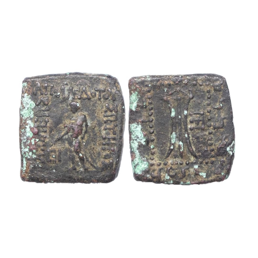 Indo-Greek, Apollodotus I (c. 180-160 BC), Square Copper Quadruple Unit, 8.17Grms, OBV: Apollo standing facing, with quiver over shoulder, holding arrow in right hand and left hand resting on grounded bow with Greek legend ‘BASILEOS APOLLODOTOY SOTHPOS’, REV: Tripod with Kharoshthi legend. (Bopearachchi & Rahman # 206). Very Fine.