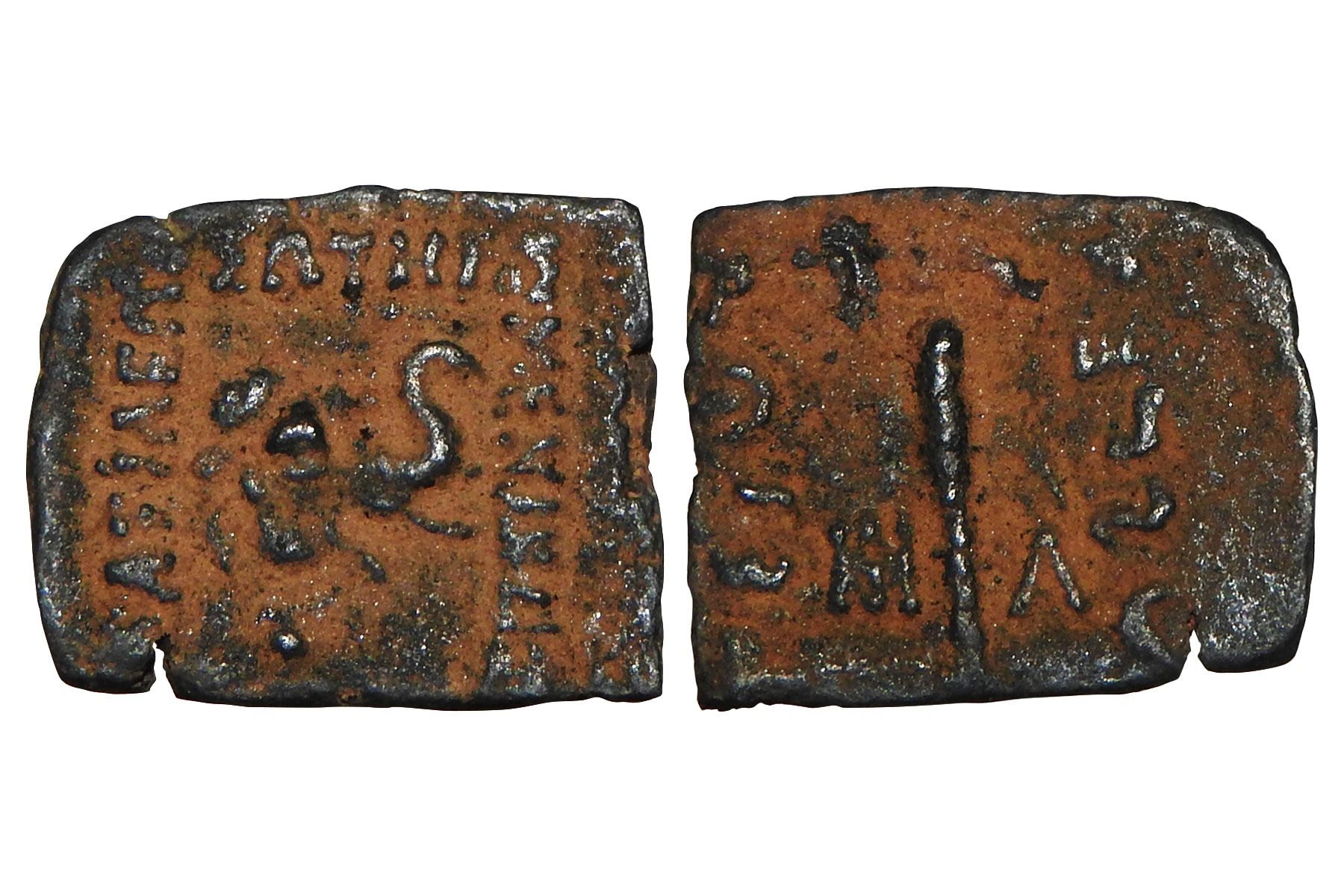 Indo-Greeks - Copper coin of Menander I, (c.155-130 BC), BN series 28, 2.20 grams. Obv: head of an elephant with trunk raised; Greek legend BASILEOS SOTEROS MENANDROU. Rev: club of Heracles in center, monogram and Kharoshthi letter on either side; Kharoshthi legend Maharajasa Tratarasa Menandrasa. Very fine, Scarce.