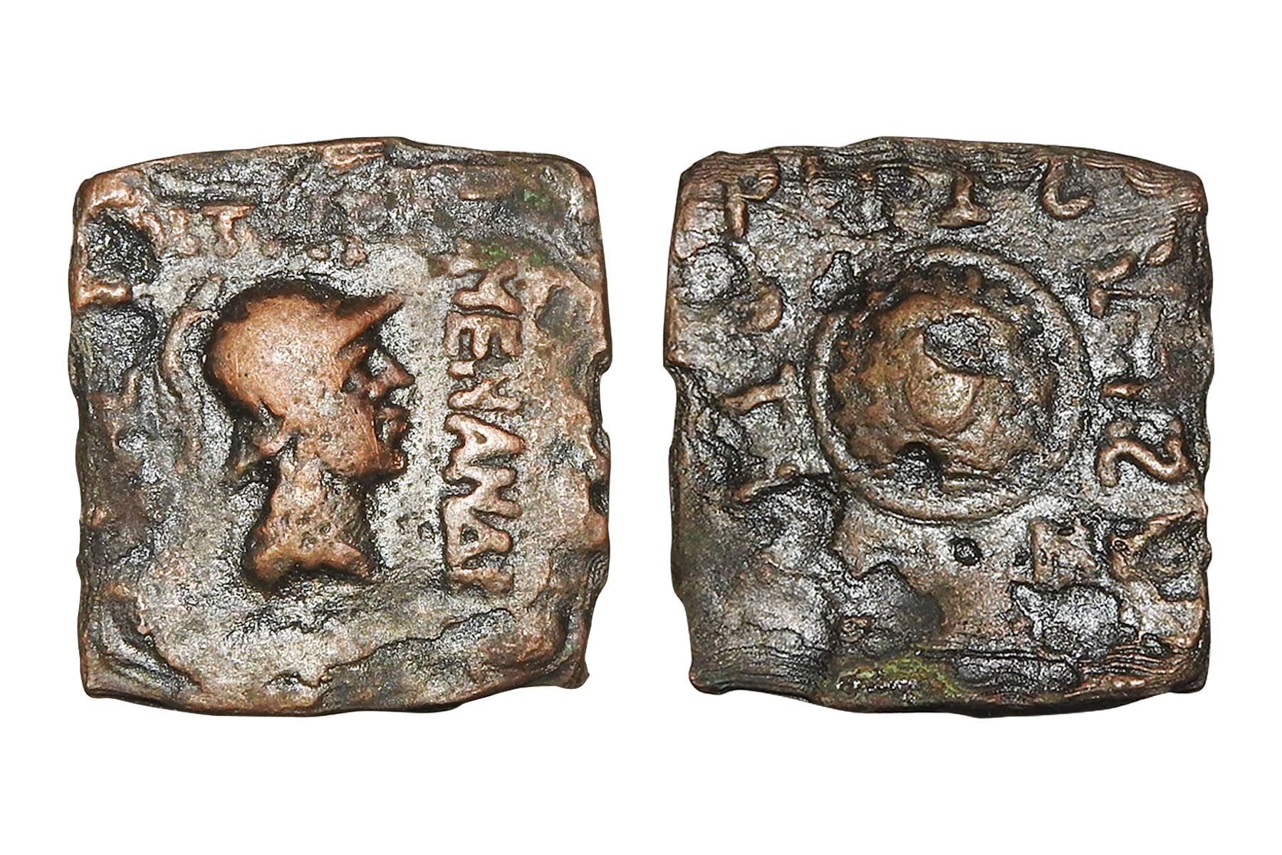 Indo-Greeks – Copper unit, Menander I, (c.155-130 BC), BN Serie 19, 7.03 grams. Obv: helmeted head of Pallas right; Greek legend …MENANDROU to right. Rev: shield with the head of Gorgon; Kharoshthi legend Maharajasa Tratarasa Menandrasa around. Very fine, Rare.