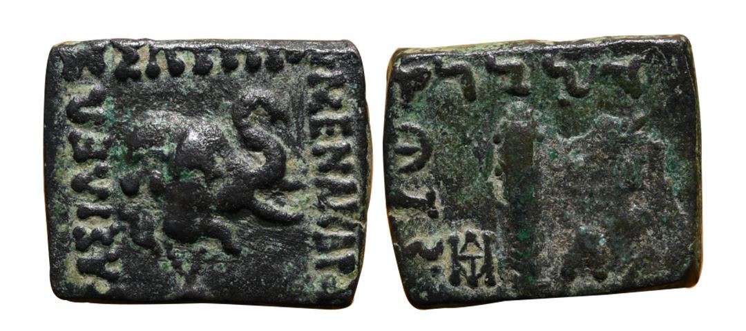 Indo-Greeks - copper chalkous/hemidrachm of Menander I, (c.165/55-130 BC), uncertain mint in Paropamisadae or Gandhara, Copper, 2.86g. Obv: head of an elephant to right, wearing bell around neck; Greek legend BASILEOS SOTEROS MENANDROU around. Rev: club of Herakles in centre, monogram to lower right; Kharoshthi legend Maharajasa Tratarasa Menandrasa around.