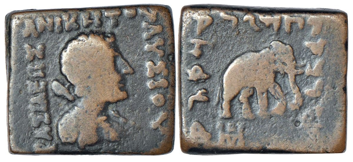 Indo-Greeks, copper unit of Lysias (c.120-110 BC), BN series 8, 8.95g. Obv: bearded bust of Heracles with club on his shoulder; Greek legend BASILEOS ANIKETOU LYSIOU. Rev: elephant walking to right, monogram in lower left corner; Kharoshthi legend Maharajasa Apadihatasa Lisikasa.