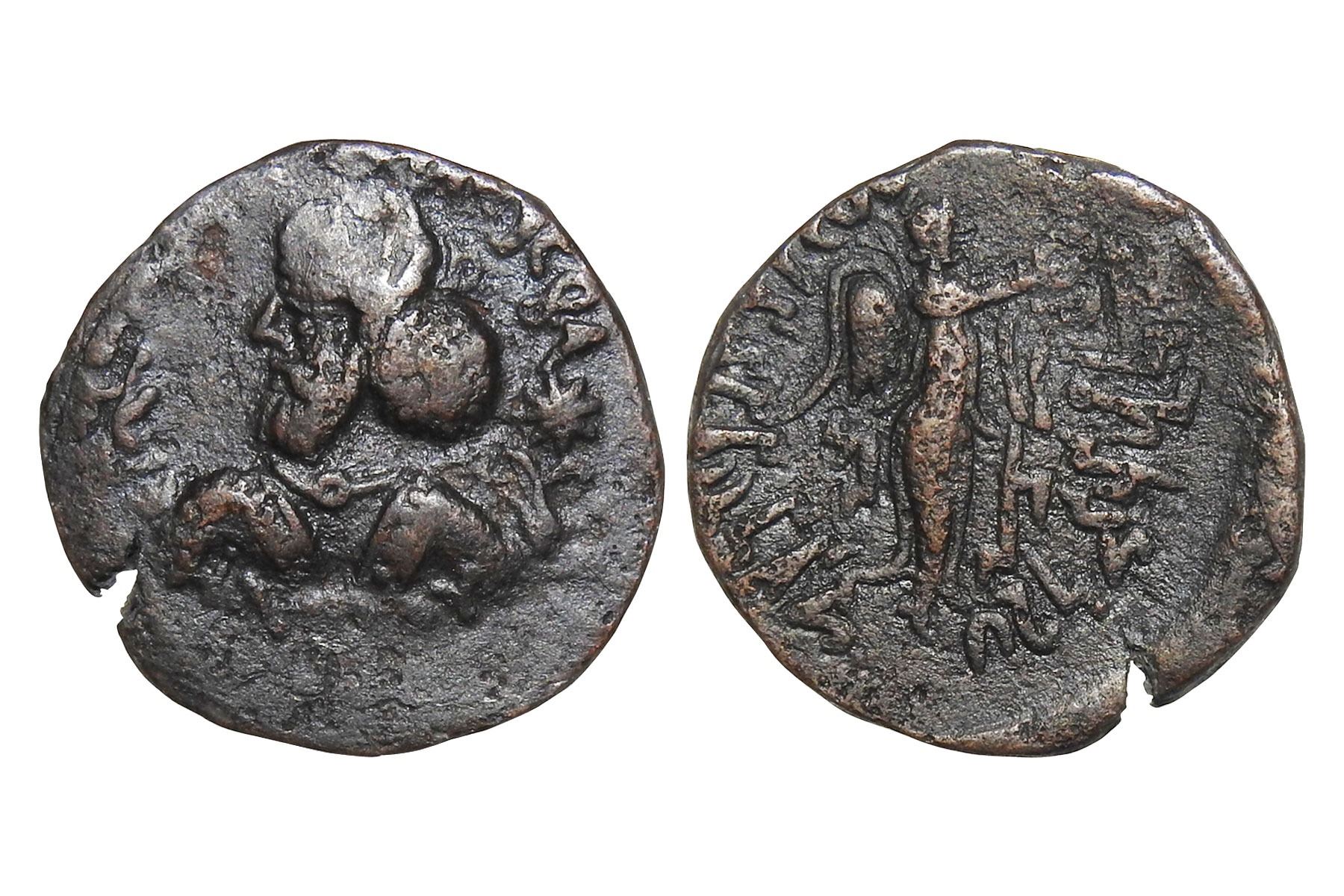 Obv: diademed bearded bust left, the star behind; traces of Greek legend. Rev: winged Nike standing right holding sceptre and wreath; Kharoshthi legend Maharajasa Rajatirajasa Mahatasa Pakurasa around.