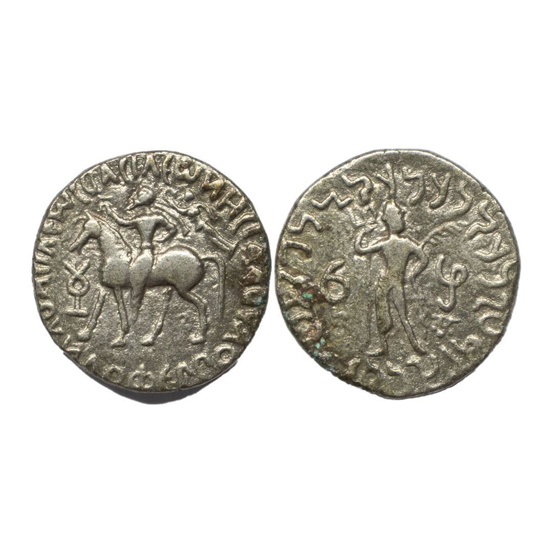 Indo-Parthians, Gondophares (c. 40-5 BC), Silver Tetradrachm, OBV: King on horseback walking to left side above nike flying behind him with wreath, monogram front of the horse and around Greek legend ‘BAΣIΛEWΣ BAΣIΛEWN MEΓAΛOY YNΔOΦEPPOY’, REV: Shiva standing facing to right side, holding trident in right hand and palm in left hand around Kharoshthi legend ‘Maharajasa rajarajasa tratarasa devavratasa Gudapharasa’. (Bopearachchi & Rahman # 983). Extremely Fine+.