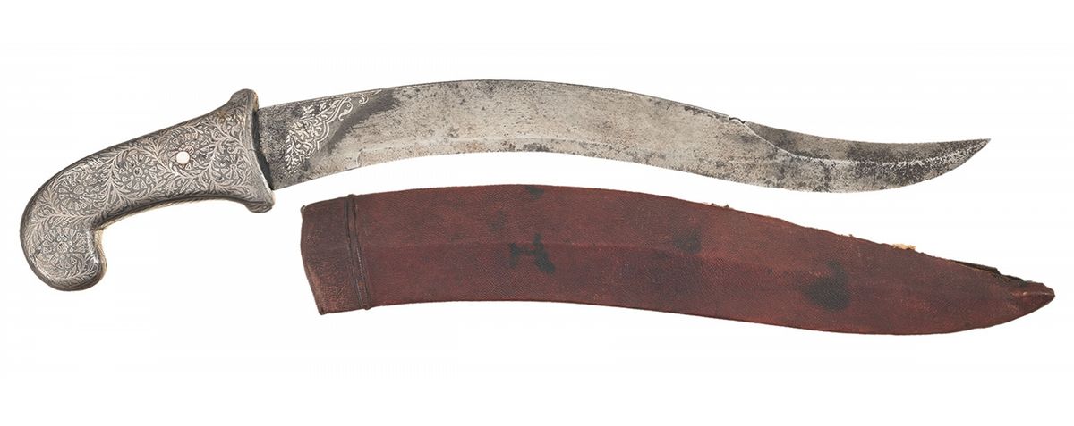 19th Century khanjar dagger measuring 17 inches overall. Equipped with a 13 inch curved blade, with a wide spine leading to the thicker mail piercing point, a small filed accent behind the 4 1/4 inch false edge, and a 2 inch wedge of silver koftgari vinework on the ricassos. Brass reinforced iron hilt, with a mother of pearl accent button on each side and extensive scroll and floral silver koftgari. With a russet leather covered sheath. Provenance: The William Ashby Collection
