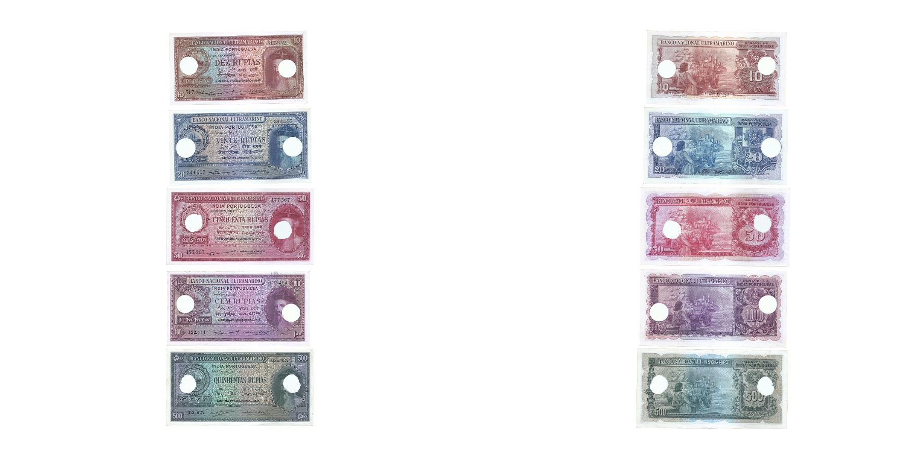 Indo-Portuguese Territories, 10, 20, 50, 100, 500 Rupias, Hole cancelled set of 5 notes,dated 29th November 1945, signed by Antonio Dos Santos Viegas as President of Administrative Council and Artur Menezes Correia De Sa as Administrator, serial no. 517,842, 344,557, 177,367, 122,414, 026,927, printed by Bradbury Wilkinson & amp; Co., (KJ & amp; RR # 12.30.6, 12.31.6, 12.32.6, 12.33.6, 12.34.6)