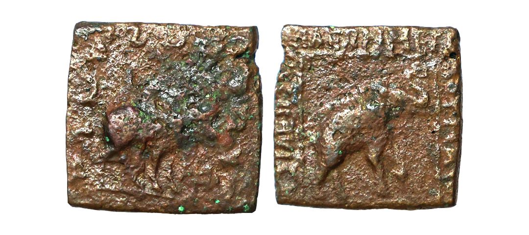 Indo Scythian, Maues (125-85 BC), Copper Obol, 8.09 gms, Obv. Elephant to right with upraised trunk & fore leg, Greek legends ‘ΒΑΣΙΛΕΩΣ ΒΑ/ΣΙΛΕΩΝ ΜΕΓΑ/ΛΟΥ ΜΑΥΟΥ’ around, Rev. Zebu standing right, Kharosthi legend " Rajatirajasa / mahatasa / Moasa " around, Senior