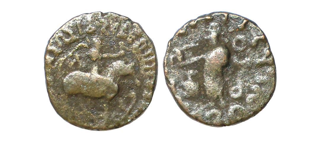 Indo Scythians, Azes II (35 BC to AD), Copper Unit, 1.88 gms, Obv. King on horseback to right holding spear & Greek legends ‘ΒΑΣΙΛΕΩΣ / ΒΑΣΙΛΕΩ/Ν ΜΕΓΑΛΟΥ / ΑΖΟΥ’ around, Rev. zeus