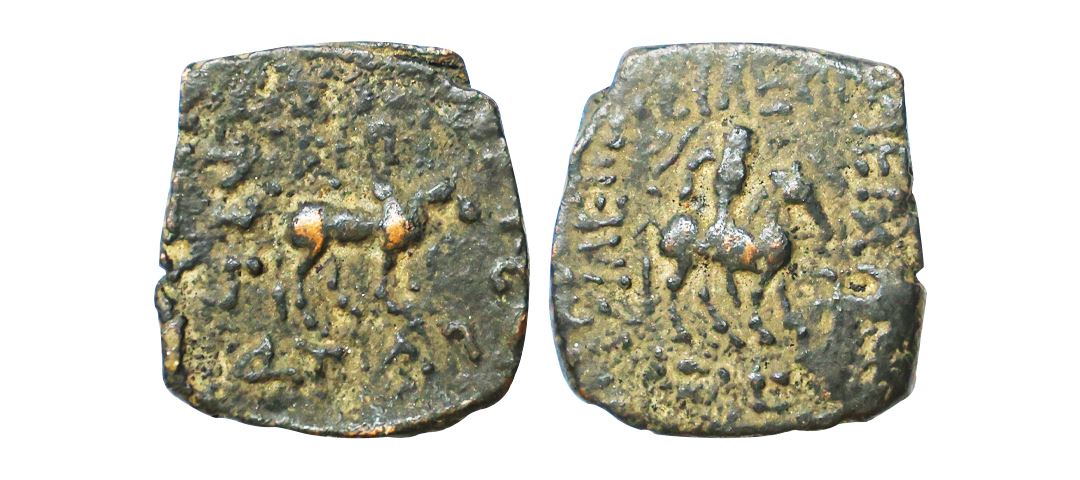 legend ‘ΒΑΣΙΛΕΩΣ ΒΑCΙΛΕΩN ΜΕΓΑΛΟΥAZIΛIΣOY’, Rev: bull to left, monograms above,Kharoshthi legend ‘Maharajasa Rajarajasa Mahatasa