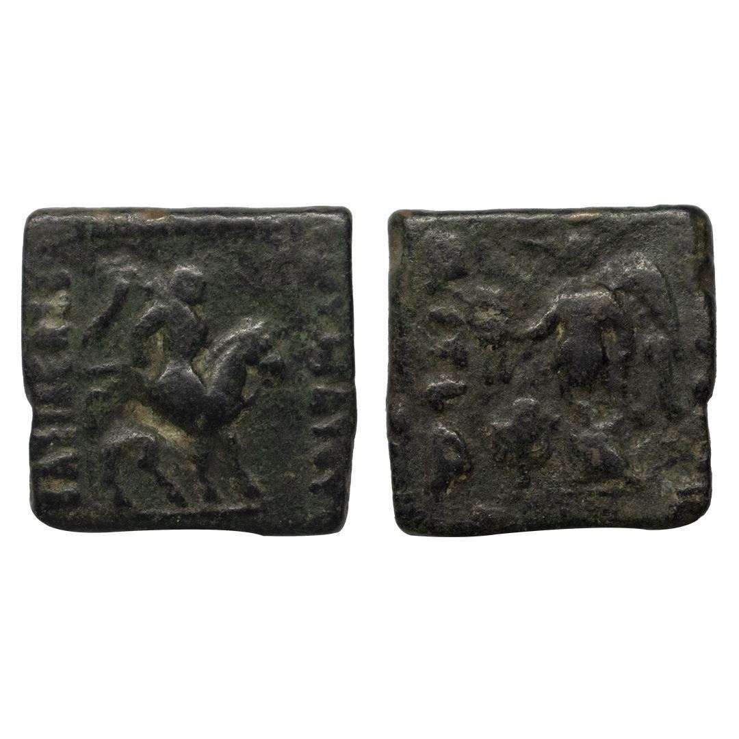 Indo-Scythians, Maues (125-85 BC), Copper Square Unit, xx.xx gms, Obverse: King on horseback to right, Greek legend around partially reading ‘BAΣI ΛEΩΣ MAYOY’, Reverse: Nike standing left, holding wreath and palm, partial Kharoshti legend around reading ‘maharajasamoasa’, Senior # 16.1, about fine, rare.