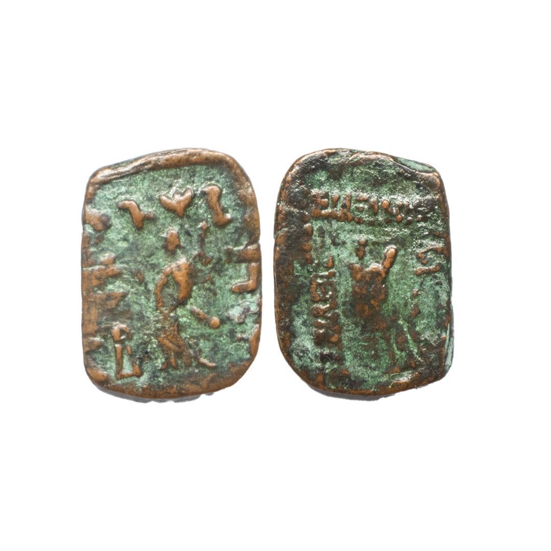 Indo-Scythians, Vonones with Spalagadames (c. 100-65 BC), Copper Square Unit, 11.85Grms, OBV: Herakles standing facing, crowning himself and holding club, with Greek legend around, REV: Athena standing left, holding spear and shield in one hand and raising the other hand, with Kharoshthi legend around (Senior # 66.2). Fine+.