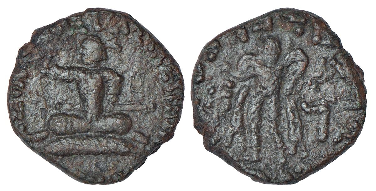 Indo-Scythians, copper half unit of Azes (c.45-12BC), ISCH 107.11, 8.74g. Obv: king seated on cushion, with legs crossed, raising hand and holding sword, Kharoshthi letter Pra to left; Greek legend BASILEOS BASILEON… around. Rev: Hermes standing left, raising hand and holding kerykeion; monogram to left, Kharosthi letter Ra to right; Kharoshthi legend …Rajadirajasa… above.