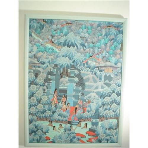 Indonesian - Signed Iwymetra Bongkashi Bali. Acryllic & pen on canvas of women bathers. Very colorful (blue & green)painting in a light blue wood frame.Measures 32"x24.25" in excellent condition.