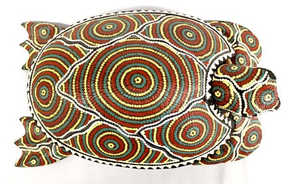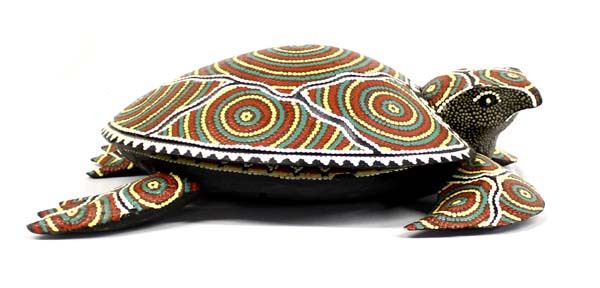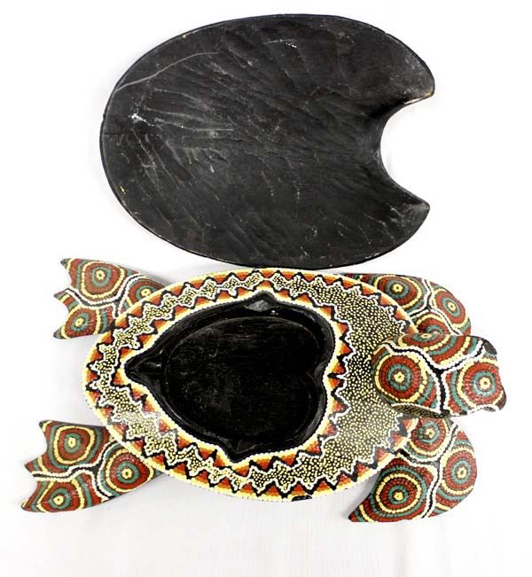 Indonesian Carved Wood Lidded Sea Turtle Box, measures 9'' x 16'' x 4'', small amount of paint loss in areas, right front fin has been glued