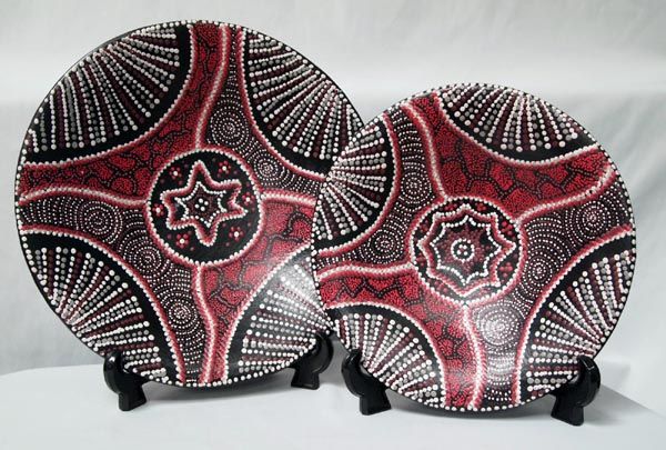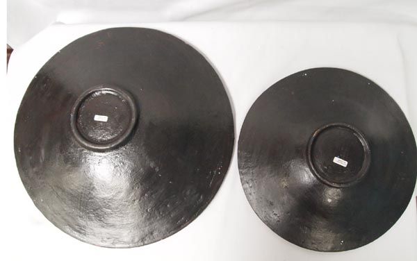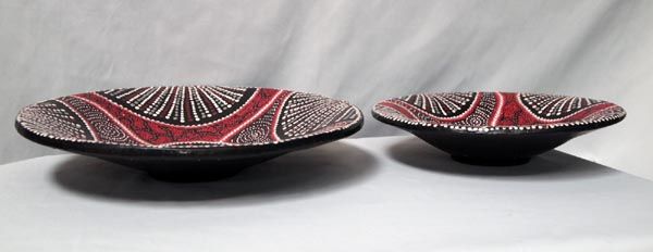 Indonesian Hand Formed and Painted Clay Bowls. Shallow bowls with intricate dot Aboriginal style pattern painted on the front of each. From Lombok, Indonesia. Small one measures 11'' diameter, large one is 14'' diameter x 2.5'' high.