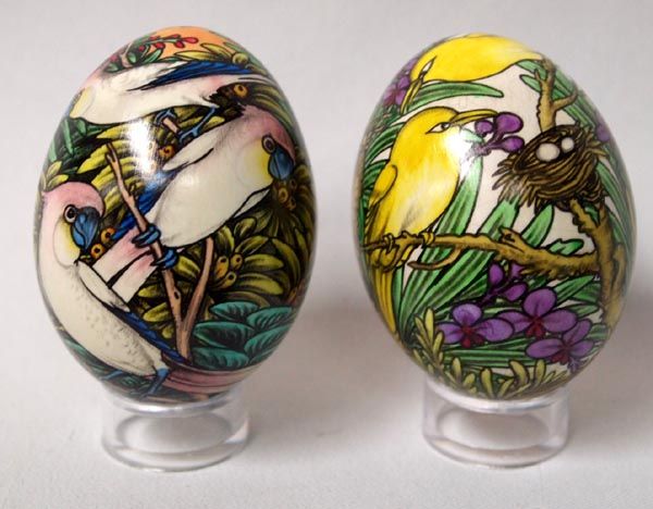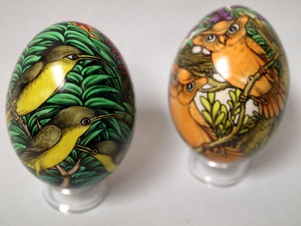 Indonesian Hand Painted Duck Eggs. Beautifully painted real duck eggs from Bali, Indonesia. Each has a small plastic ring stand and each measures 2.25''L.