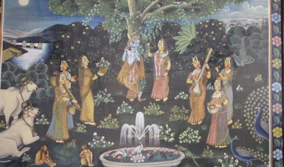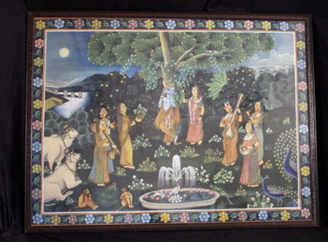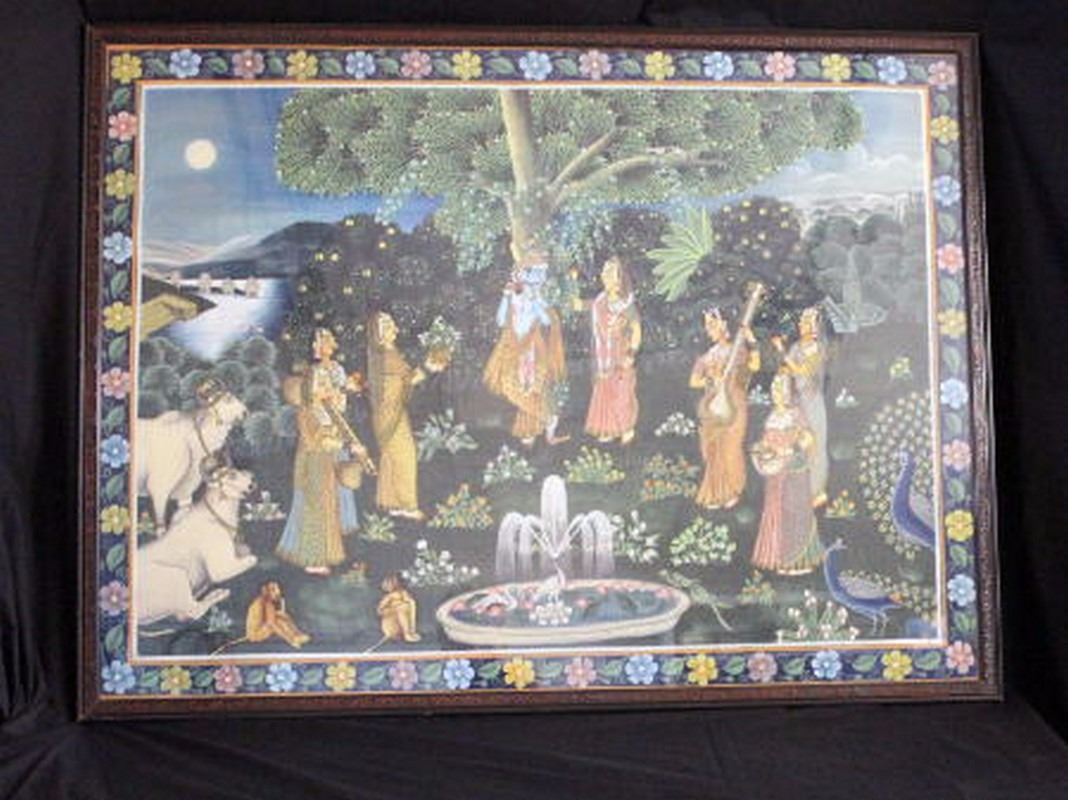 Large Late 19th-Early 20th Century Exotic Depiction of Lord Krishna & Lady Radha Painting (Batik) with Original Decorative Wooden Frames 44x34" (in Batik) The development and refinement of Indonesian batik cloth was closely linked to Islam. The Islamic prohibition on certain images encouraged batik design to become more abstract and intricate. Realistic depictions of animals and humans are rare on traditional batik. However, mythical serpents, humans with exaggerated features and the Garuda of pre-Islamic mythology are common motifs.