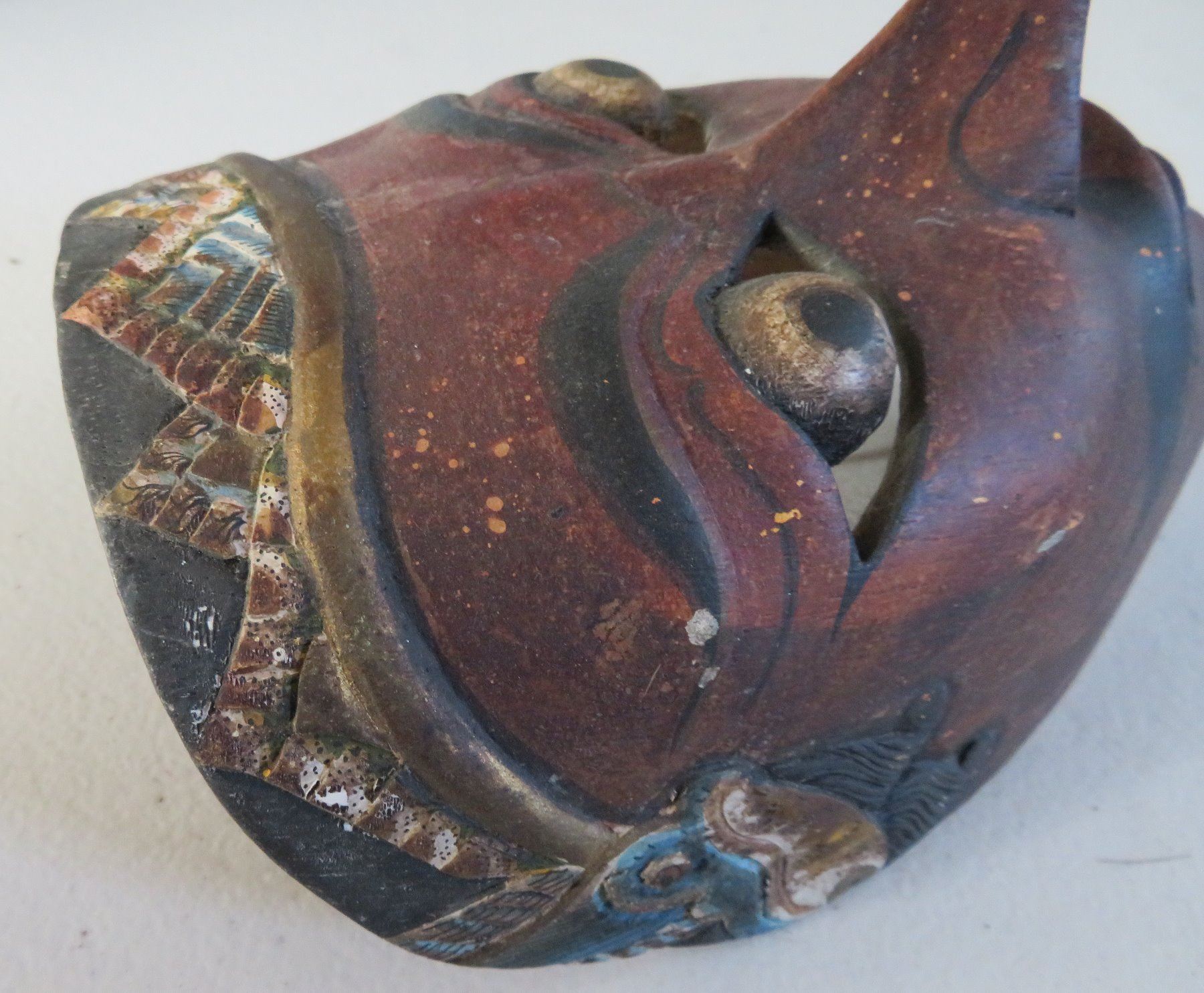Indonesian Mask, c. 1930s. Made of wood and paint, the item measures 7 1/2" long x 5 1/2" wide. Indonesian. Wood mask with highly detailed and colorful decoration along hairline. Condition: Excellent w/minor chip to tip of nose, see images. Shipping: $20.00 w/insurance and signature.