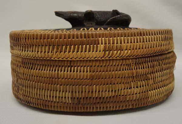 Indonesian Oval Reed Box w/Crocodile Lid Handle. Hand carved wood crocodile. Box measures 7''x2.5''. SHI $20.