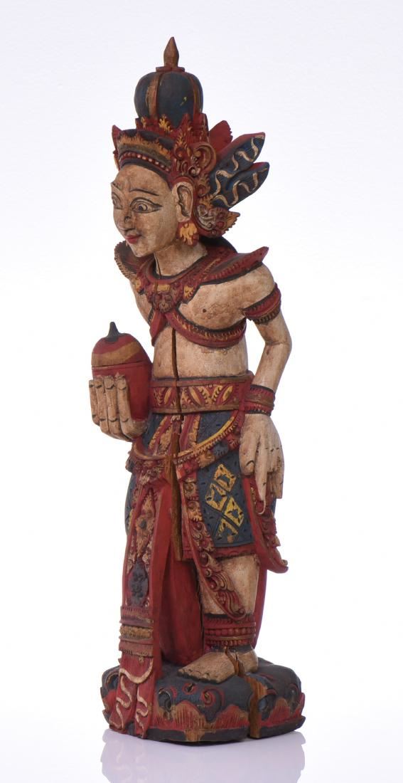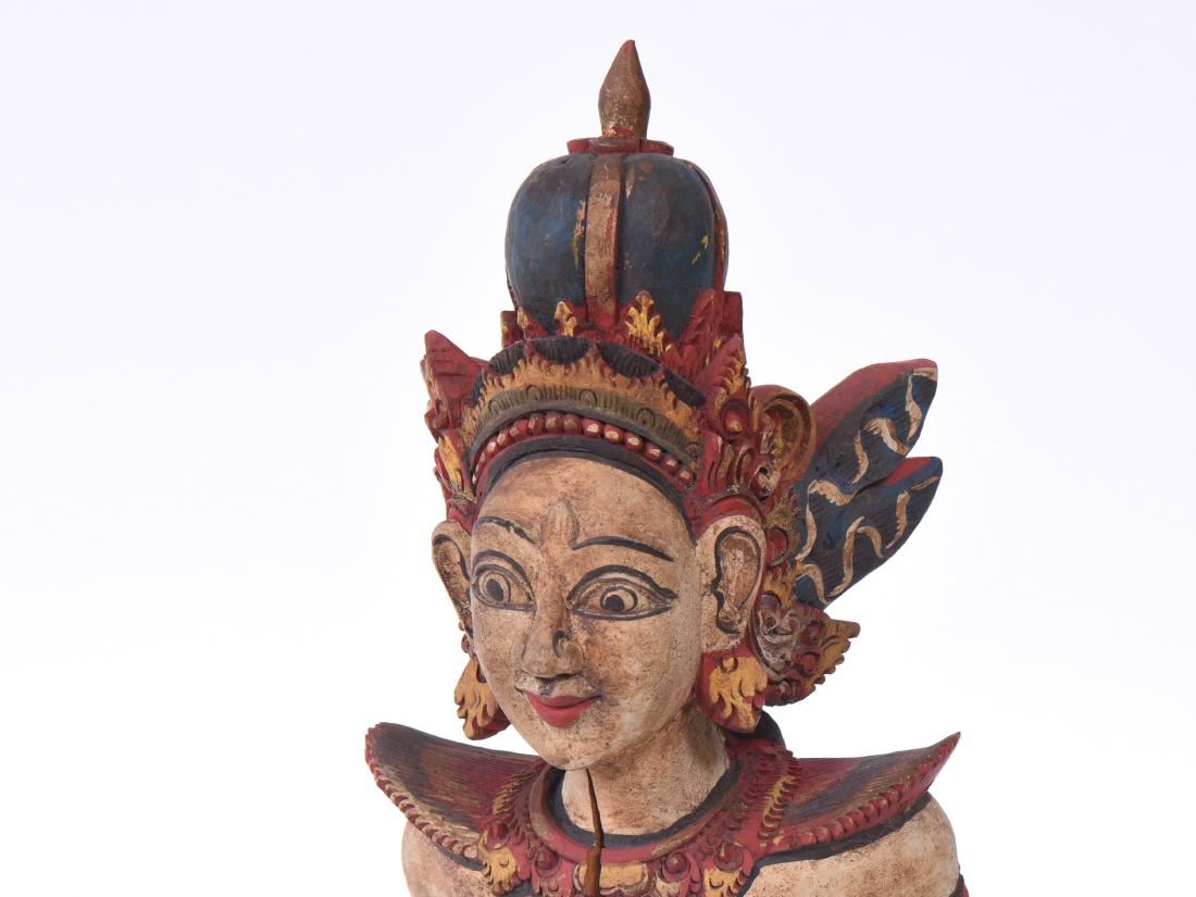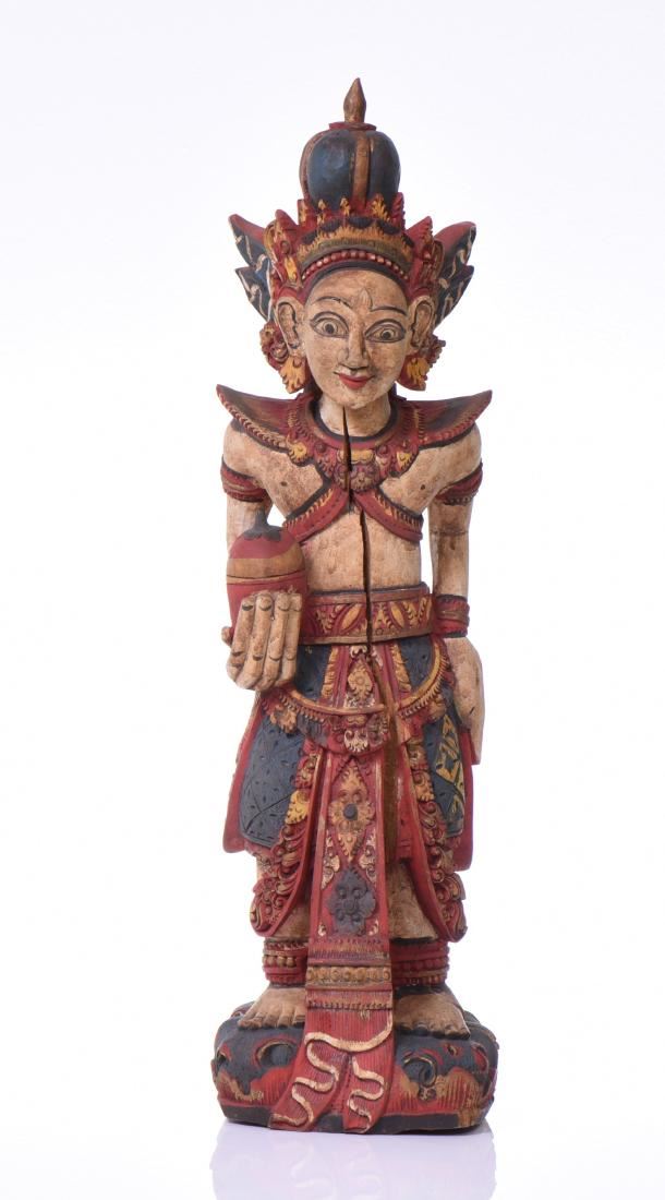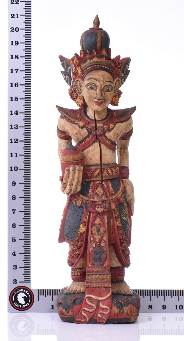 Indonesian Polychrome Hand Carved Wood Hindu Deity Of A Young Vishnu. Estimated more than 100 yrs old. Indonesian art consists of various artistic expressions and artworks of the archipelagic nation of Indonesia. It includes both age old art forms and recently developed contemporary art. Indonesian arts have experienced foreign exposures and influences most notably from India, Arabia, China and Europe. The nation consists of 13,466 islands where 922 are permanently inhabited by over 300 ethnic groups speaking more than 700 living languages. Wood and stone sculpting tribal art has flourished within the culture of Nias, Batak, Asmat, Dayak and Toraja. Between 8th to 15th century, Javanese civilization has developed a refined stone sculpting art and architecture which was influenced by Hindu-Buddhist Dharmic civilization. The art of wood carving is quite well-developed in Indonesia and certain areas are well known for its refined wood carving culture in Jepara and Bali. Balinese painting tradition are notable for its highly vigorous yet refined intricate art which resembles baroque folk art with tropical themes. Modern Indonesian paintings were pioneered by Raden Saleh, an 19th century an Arab-Javanese painter renowned for his romantic-naturalistic work during Dutch East Indies period in Indonesia. Prominent Indonesian painters in 20th century includes Basuki Abdullah, Lee Man Fong, Ida Bagus Made, Dullah and Affandi. (Wikipedia) Size: See Ruler Photo. (Photos Represent The Condition Of The Lot.)