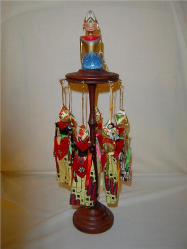 Set of Six 6.5" Miniature Wayang Golek or Rod Puppets from Java, Indonesia,(Stand is 18" tall). Rod Puppets and the stories they portray are an important component of the Sudanese culture of Java. Dating back to the eight century, these puppets continue to perform in open-air theaters during important holidays, festivals and rituals.