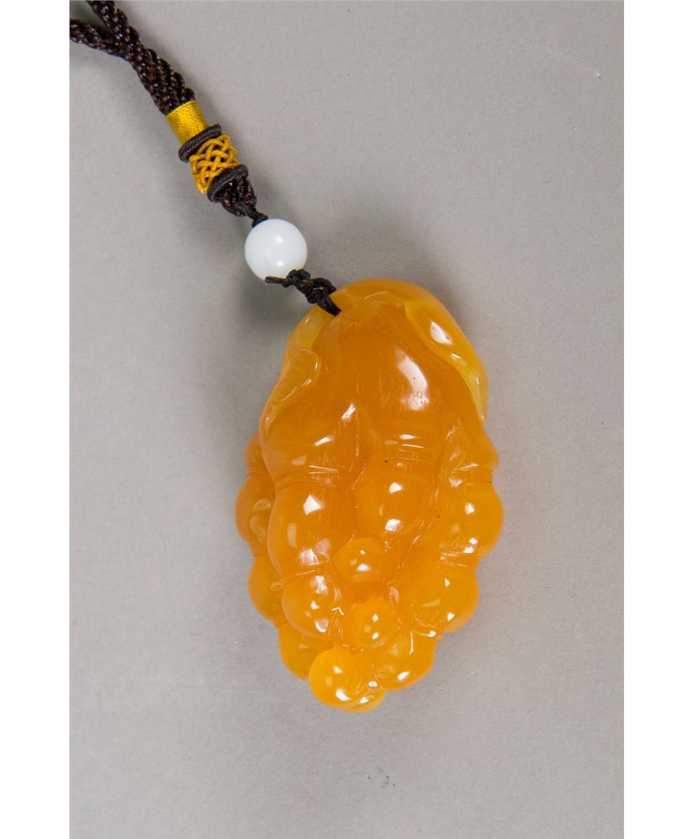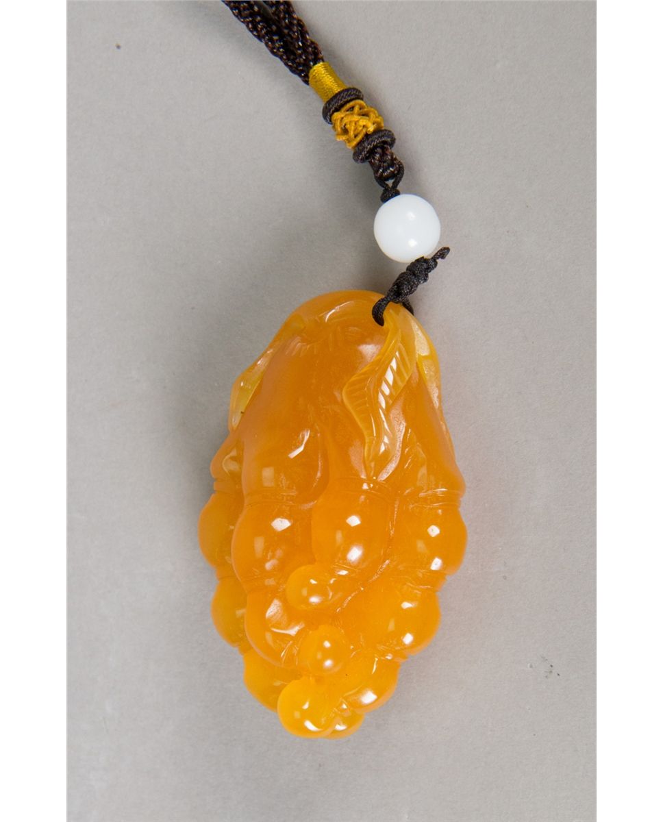 Indonesian Tianhuang stone carved pendant; featuring grapes; of honey tone; pierced for suspension; H: 7 cm, W: 4 cm, 80 grams