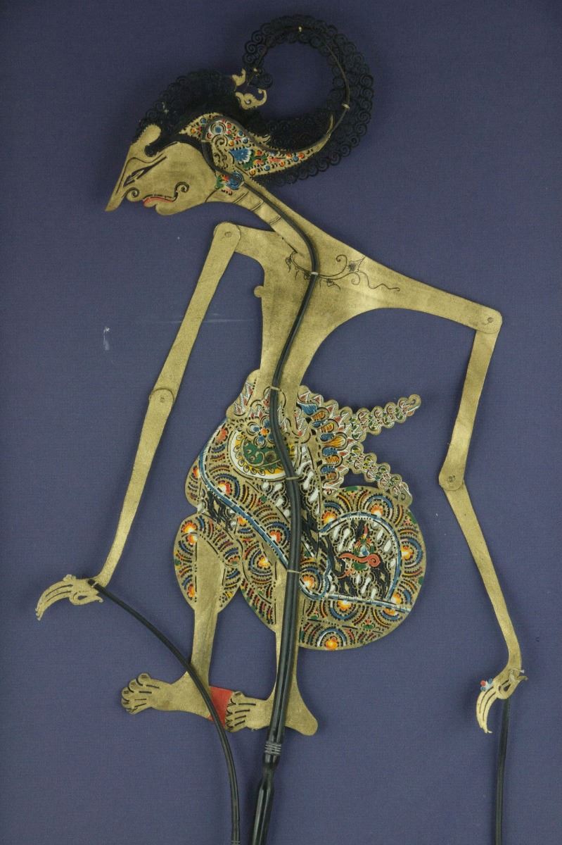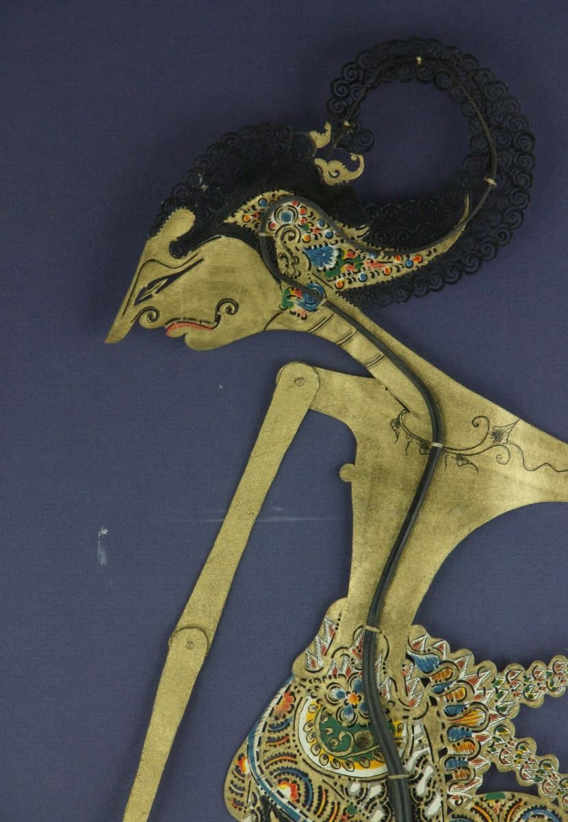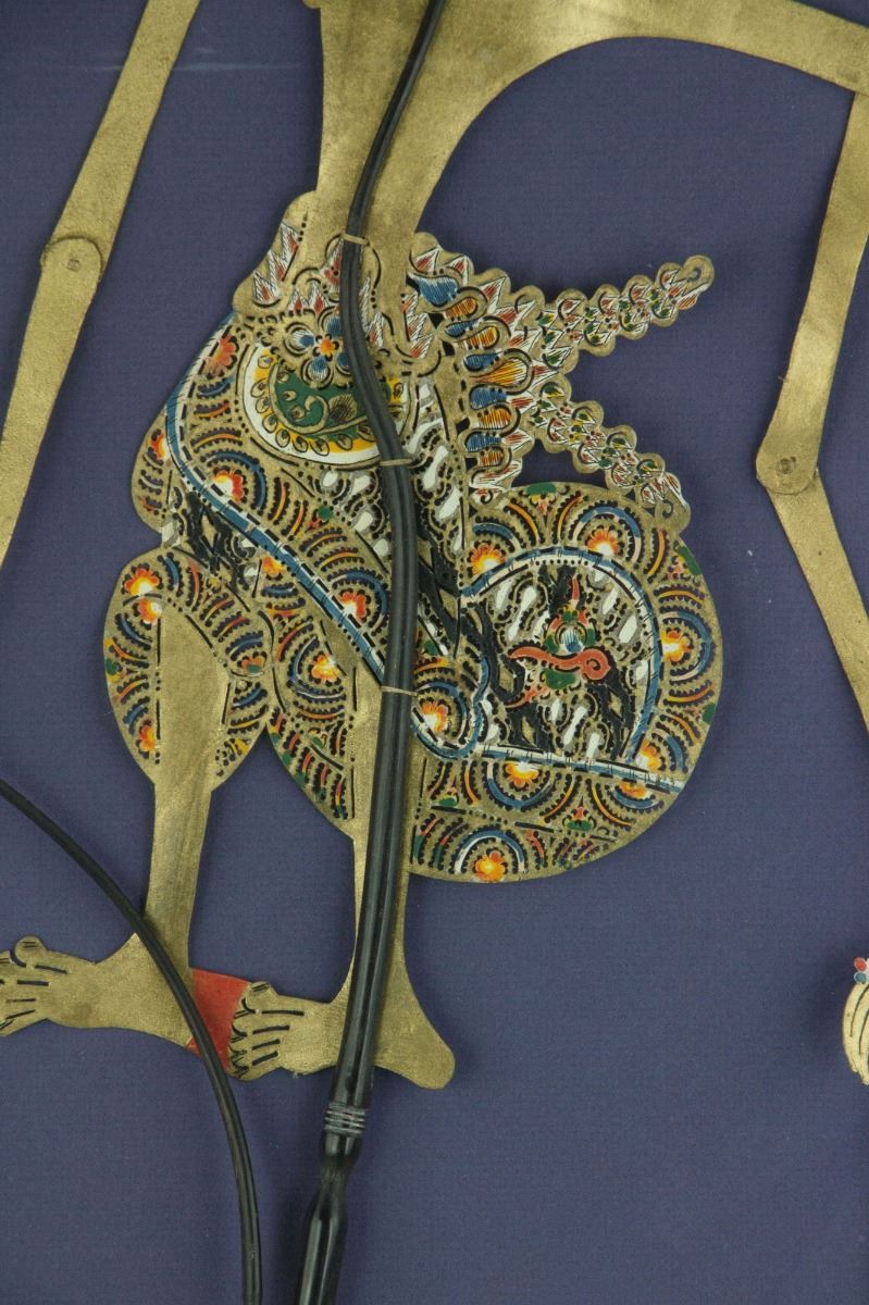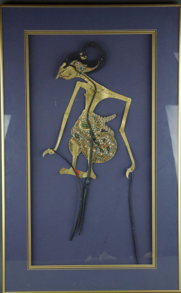 Indonesian Wayang kulit shadow puppet; depicting a Hindu woman character; mounted on board and framed; 58 cm× 94 cm