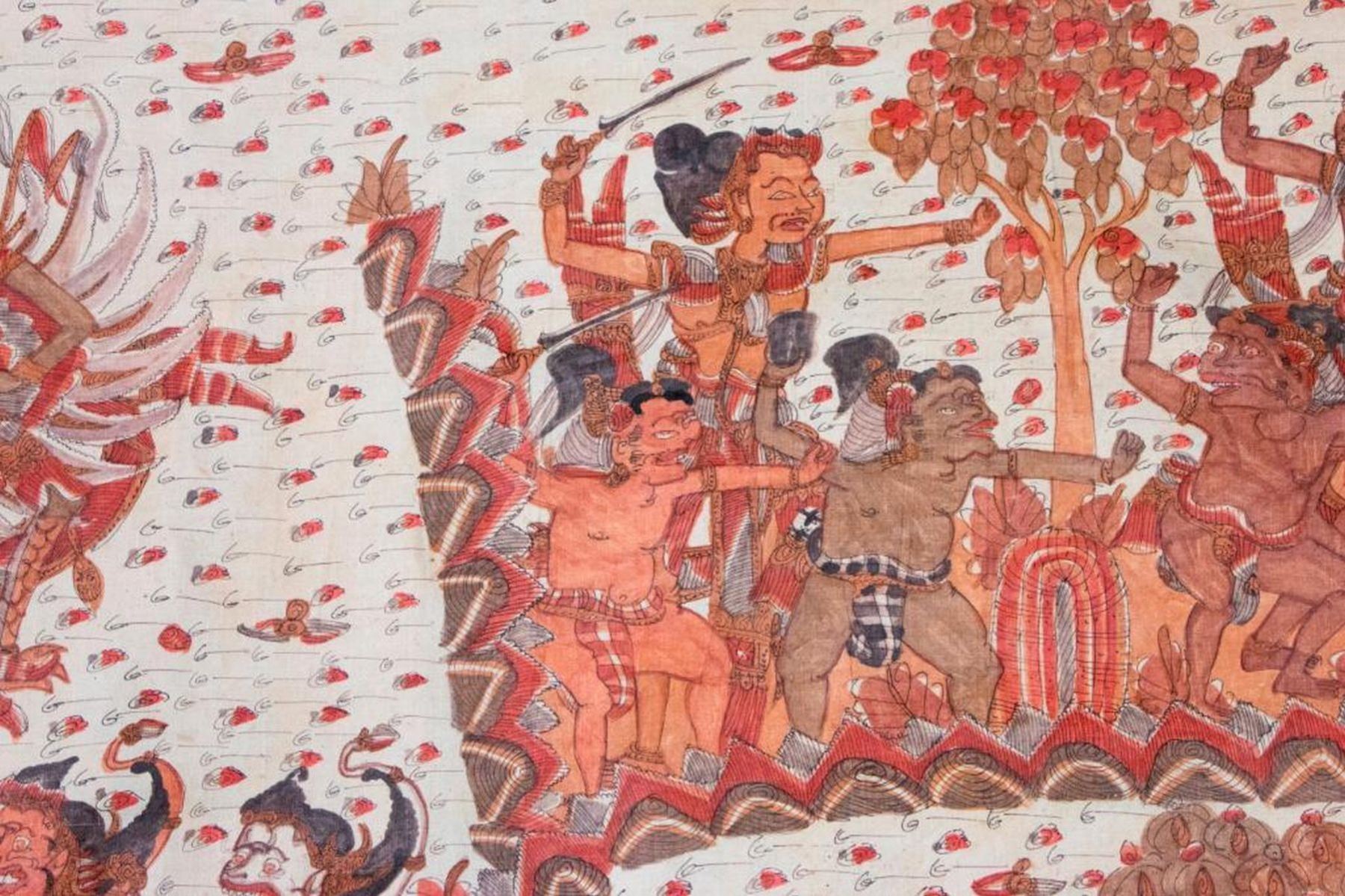 An Indonesian mythological scene printed on fabric measuring 74 inches x 34.