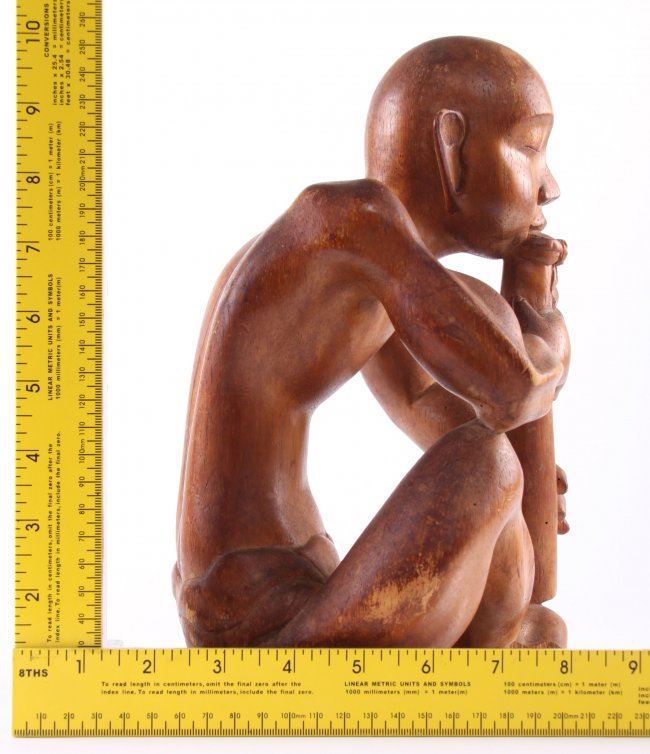 Indonesian wood sculpture carving of a man playing an instrument. Condition Report: Broken foot. SIZE: see attached ruler photo. Photos are part of the description representing the condition report and can be used for authentication prior to the sale date. Pangaea Auctions urges Bidder's to view all attached photos in detail. #(Indonesian19th-20th Century, Fine Art- Sculpture, Carving, Wood, Balinese, ).
