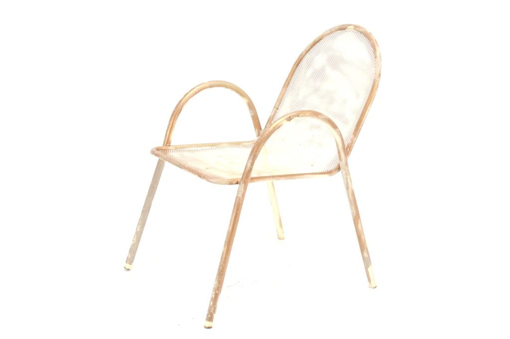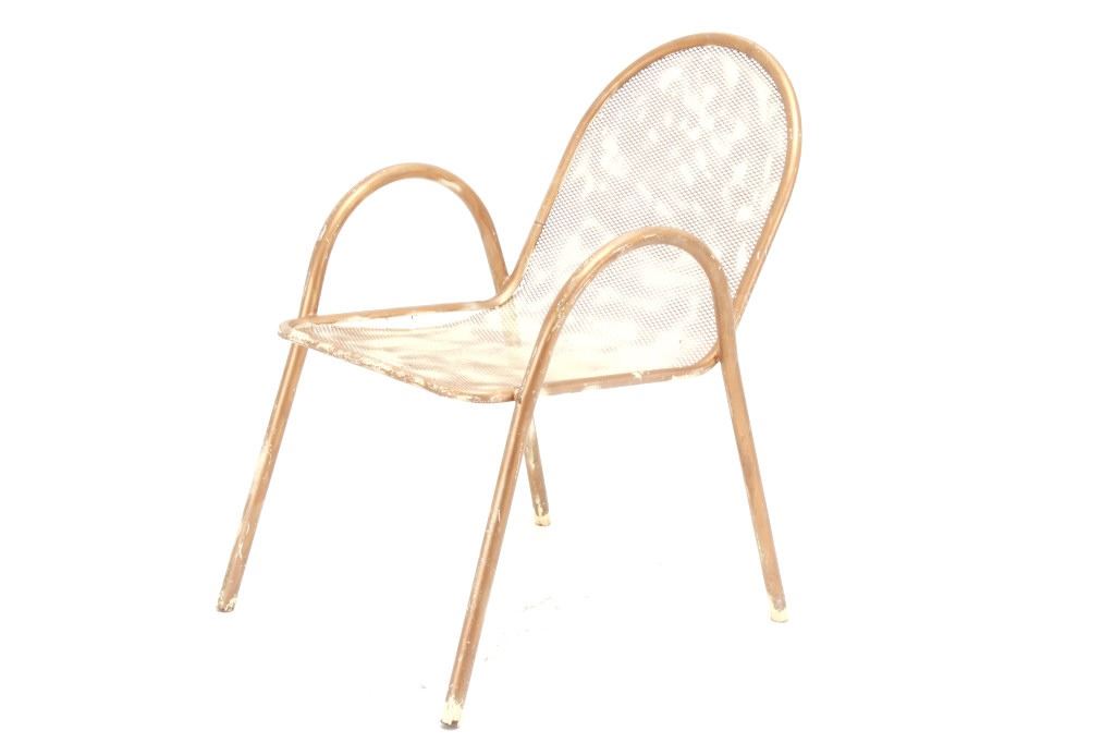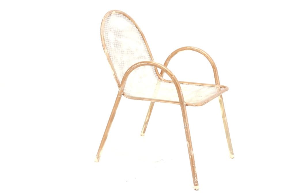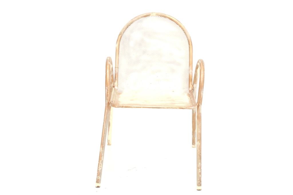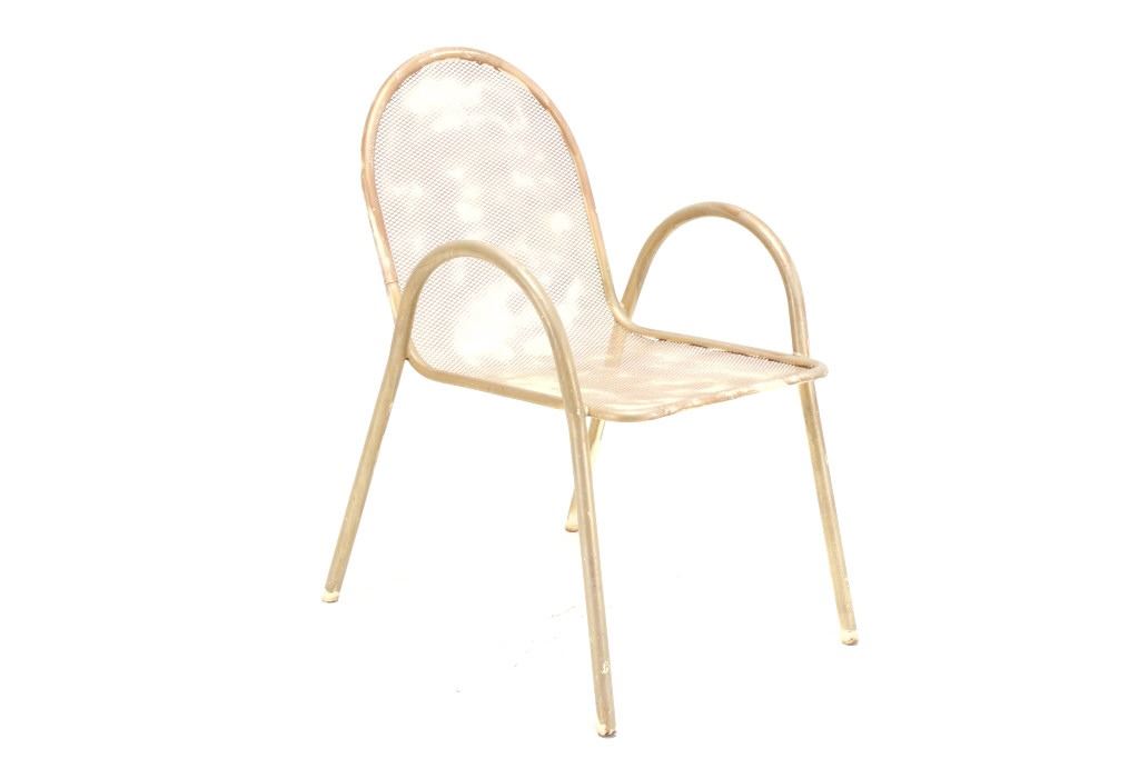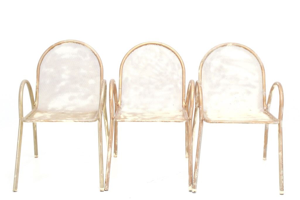 Featured in this lot is this collection of Industrial Cafe style chairs circa 1970's. There are three chairs in this collection. The chairs feature steel grate construction with rolled steel frame with sun bleached surfaces and gold paint overtones. The condition of these chairs structurally sound with fair overall condition with the surface painted over with gold paint. The measurements of these chairs are 20 3/4" x 25 1/2" x 32" for each chair.