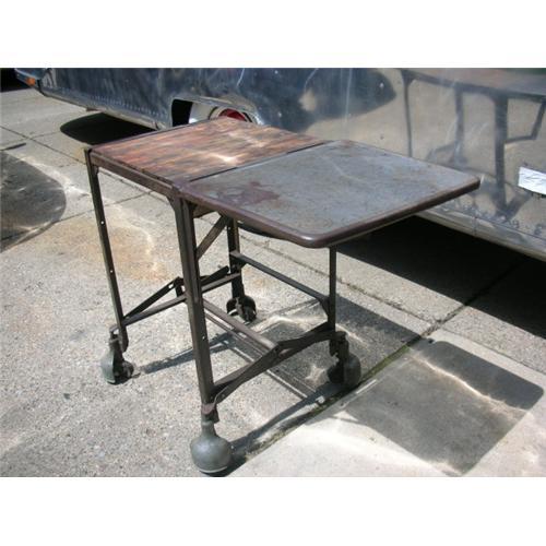 Metal and wood table- folding extension. Wood top - 6 slats bolted to frame; Metal frame and fold out extension; Steel castors with steel feet that lower w/ a shift mechanism. Very practical. Size: Top: 17" L x 17" W x 26.5" H. Bottom: 22" L x 22" W x 26.5" H. Extension: 18" L x 14.5" W.