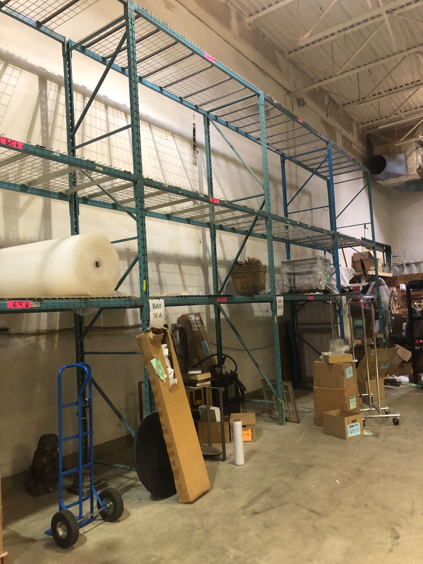 Industrial Pallet Racking - Includes 10 Vertical beams and 50 horizontal beams, 50 mesh decking shelves (Approx., 5 Vertical beams 16ft tall, 5 vertical beams 14ft tall x Horizontal beams 8ft wide, 20 4 1/2in thick, 30 3 1/2in thick x Shelves 3 1/2ft dept) (Content not Included )