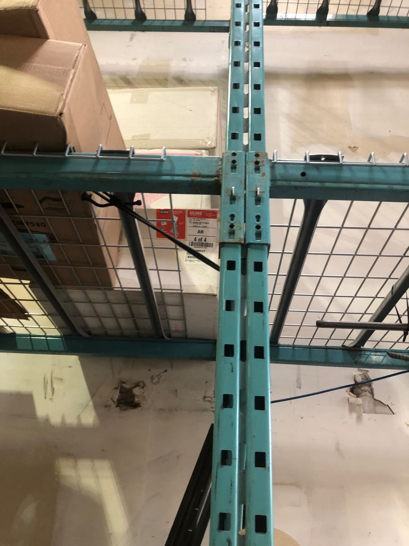 Industrial Pallet Racking - Includes 4 Vertical beams and 12 horizontal beams, 11 mesh decking shelves (Approx., Vertical beams 15.6ft tall x Horizontal beams 9ft wide,3 1/2in thick x Shelves 3 1/2ft dept) (Content not Included)