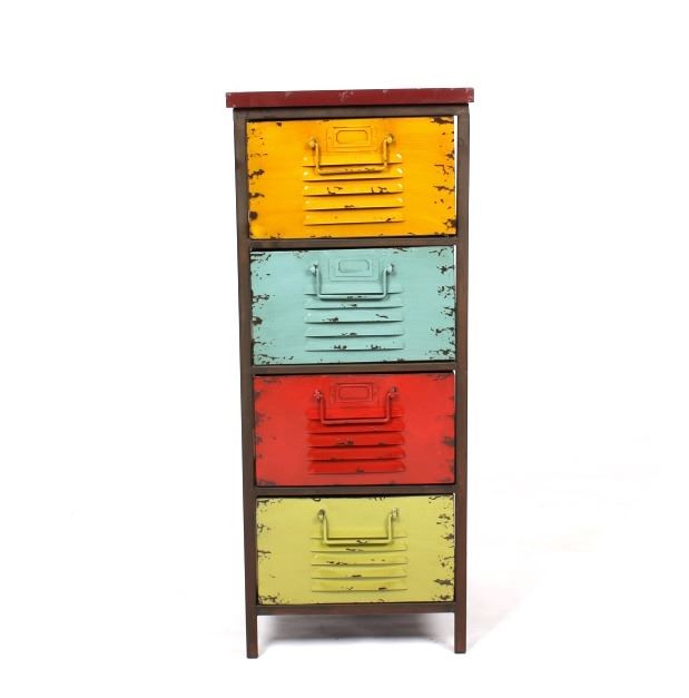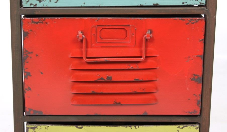 Offered for your bidding pleasure we have a multi-color metal storage shelving unit. This item showcases four metal drawers all displaying different vibrant colors. These colors work together to form this unique piece of furniture. The storage unit shows good condition and measures 45" tall X 12" X12".
