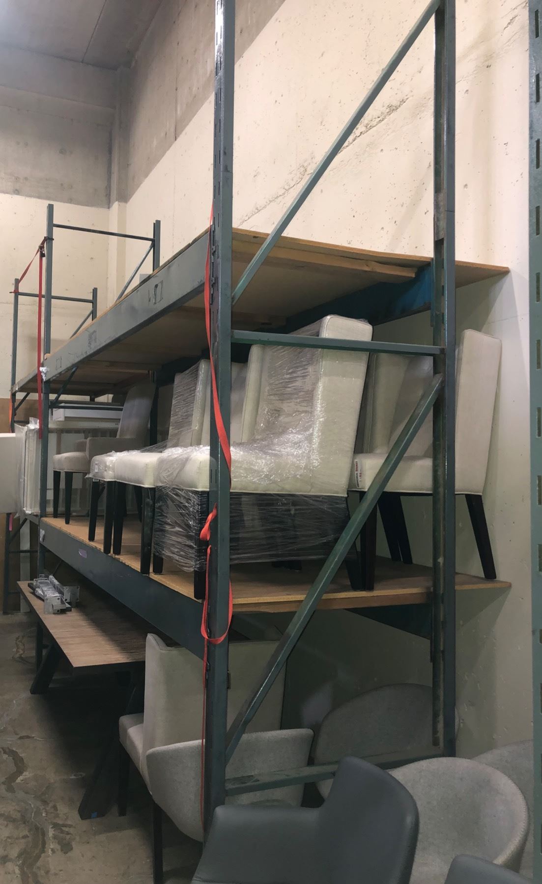 Industrial shelving rack - Includes 6 Vertical beams and 8 horizontal beams with wooden Shelf, 4 shelves (Approx., Vertical beams 12ft tall x 4 Horizontal beams 12ft wide, 4 Horizontal beams 8ft wide x Shelves 3ft dept) (Content not Included )