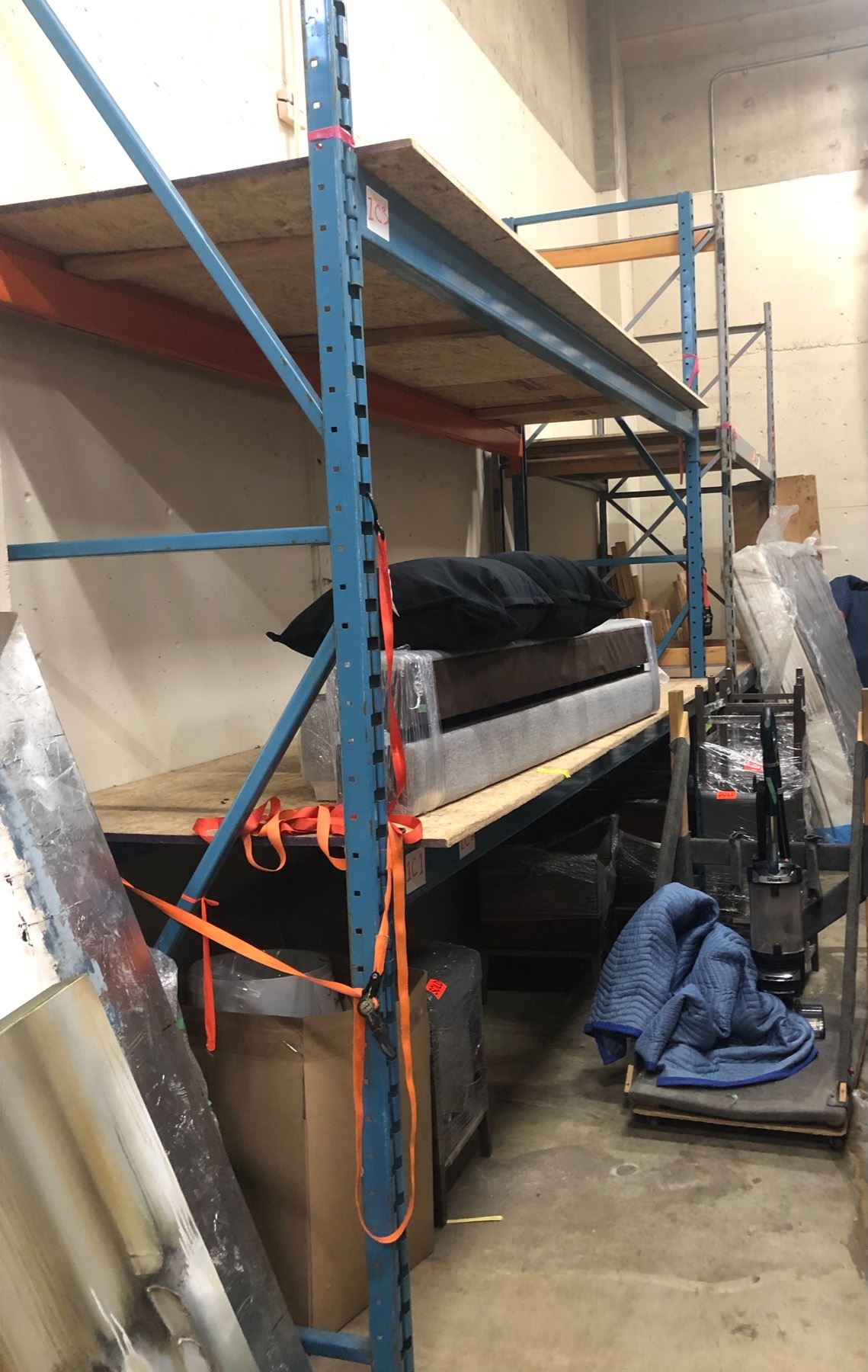 Industrial shelving rack - Includes 8 Vertical beams and 8 horizontal beams with wooden Shelf, 4 shelves (Approx., Vertical beams 12ft tall x 4 Horizontal beams 12ft wide, 4 Horizontal beams 8ft wide x 2 Shelves 3ft dept, 2 Shelves 4ft dept) (Content not Included )