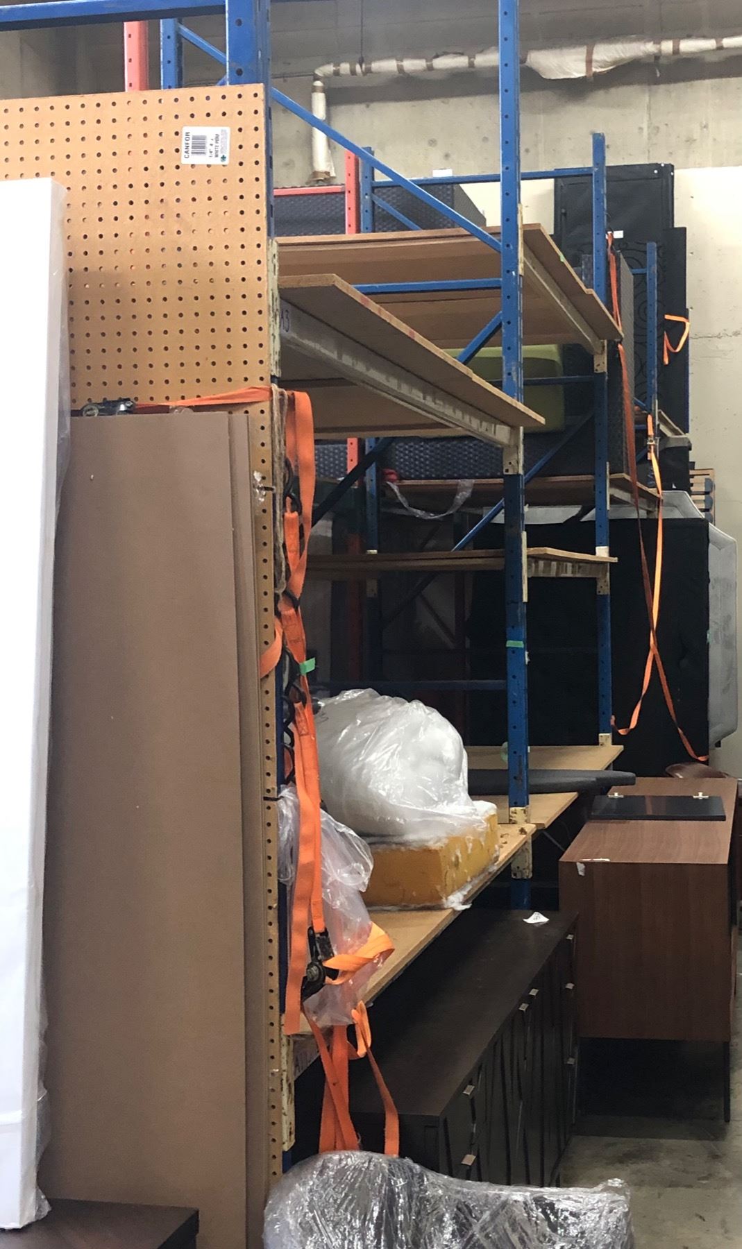Industrial shelving rack - Includes 10 Vertical beams and 16 horizontal beams with wooden Shelf, 8 shelves (Approx., Vertical beams 12ft tall x Horizontal beams 8ft wide, x Shelves 3ft dept) (Content not Included )