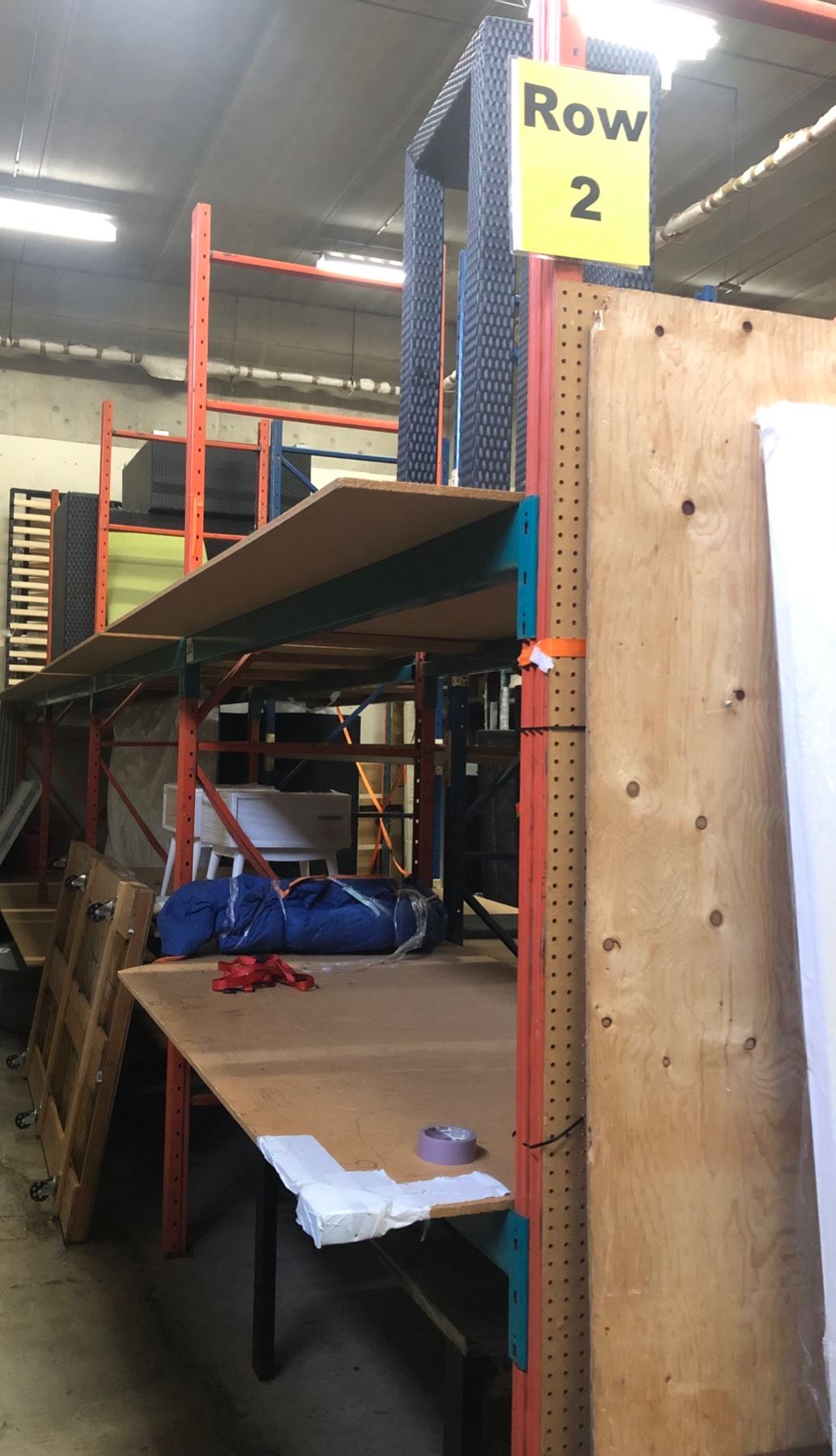 Industrial shelving rack - Includes 10 Vertical beams and 16 horizontal beams with wooden Shelf, 8 shelves (Approx., Vertical beams 12ft tall x Horizontal beams 8ft wide, x Shelves 3ft dept) (Content not Included )
